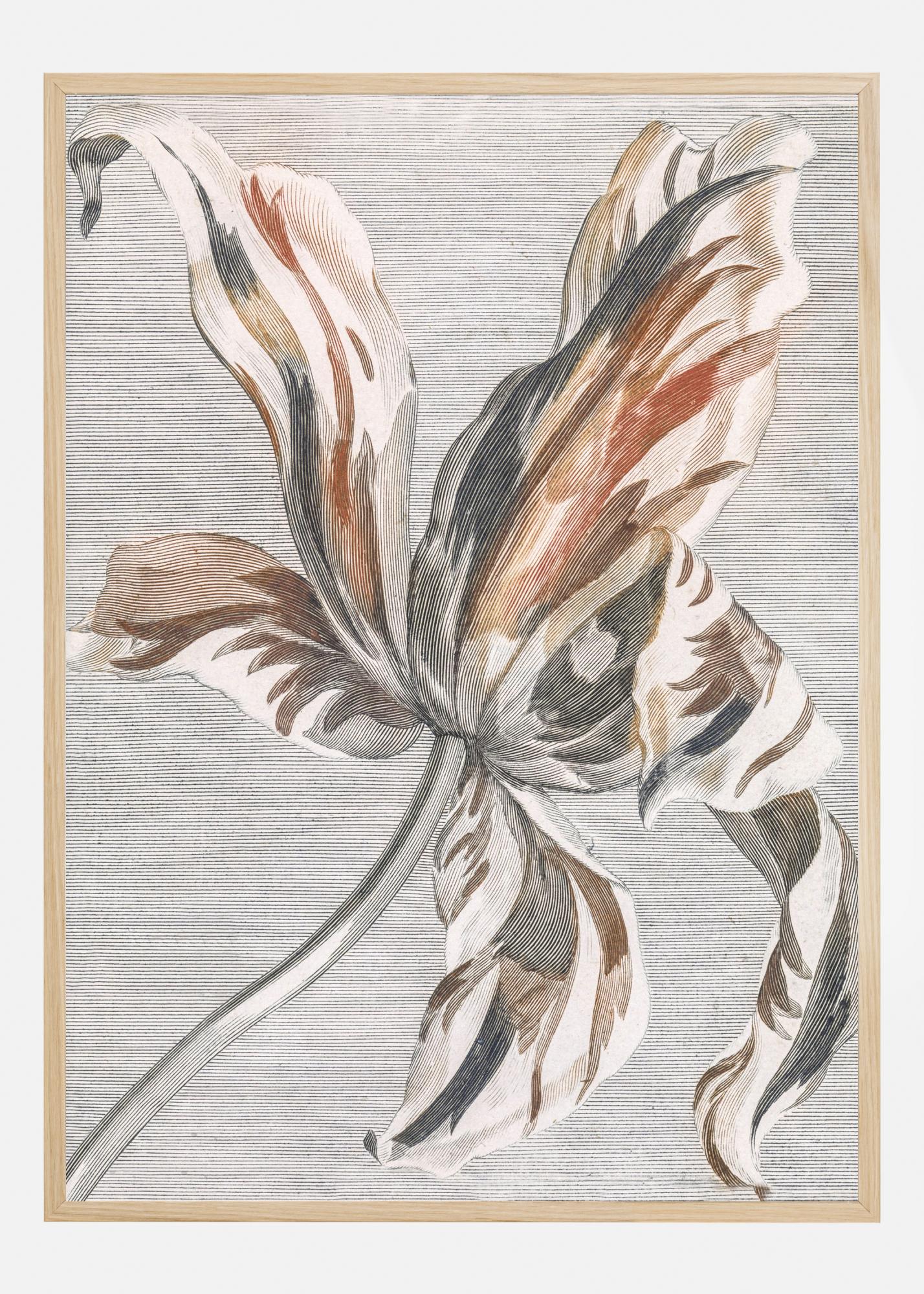 Gėlių plakatas su drąsia dryžuota gėle raudona, balta ir pilka spalvomis. Tekančios teptuko potėpiai atitinka žiedlapių linijas, suteikdami gyvybės kūriniui. Derinkite stiprias raudonas spalvas ant sienos, kurioje jį pakabinsite, kad pasiektumėte dar gyvesnį efektą.