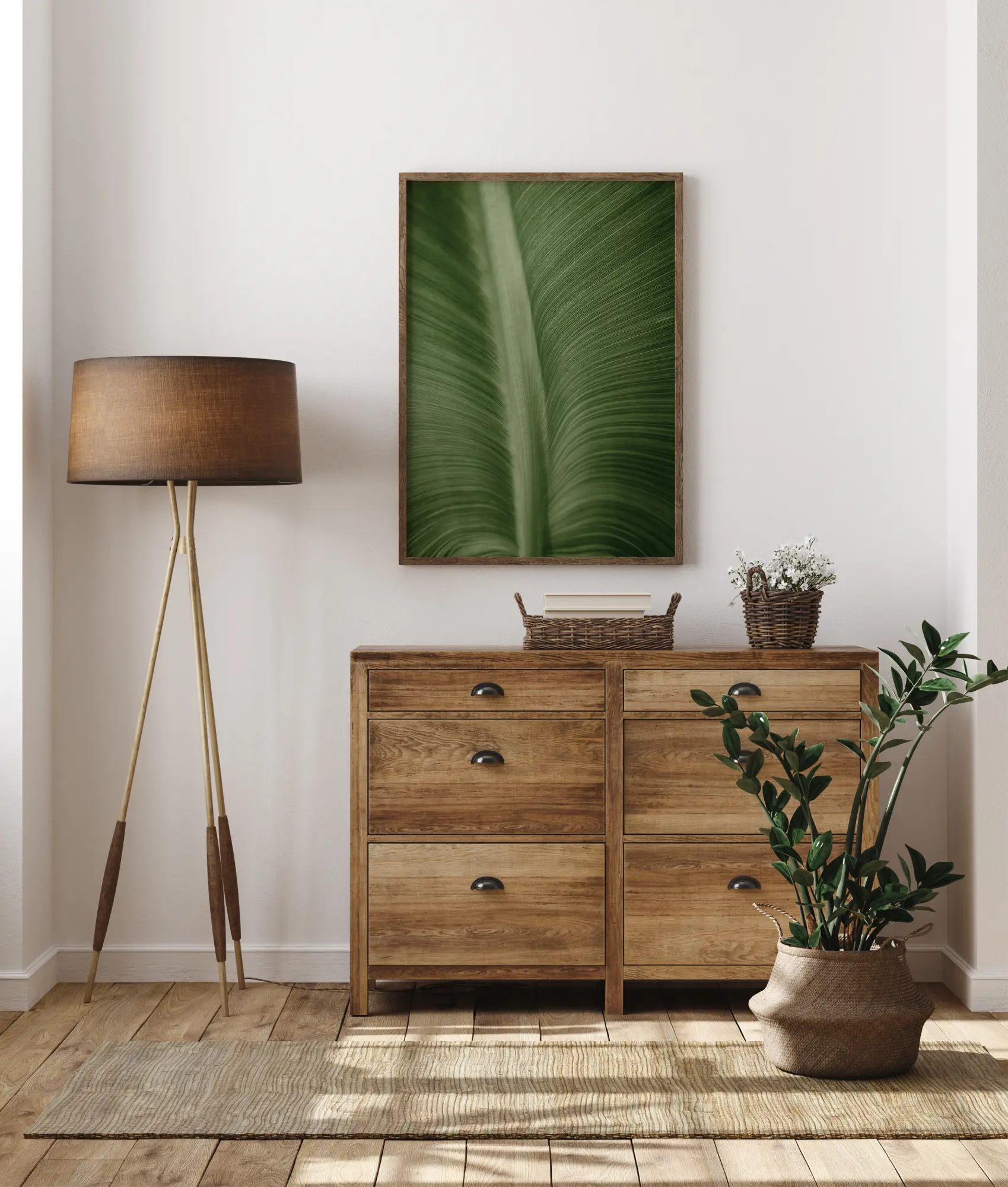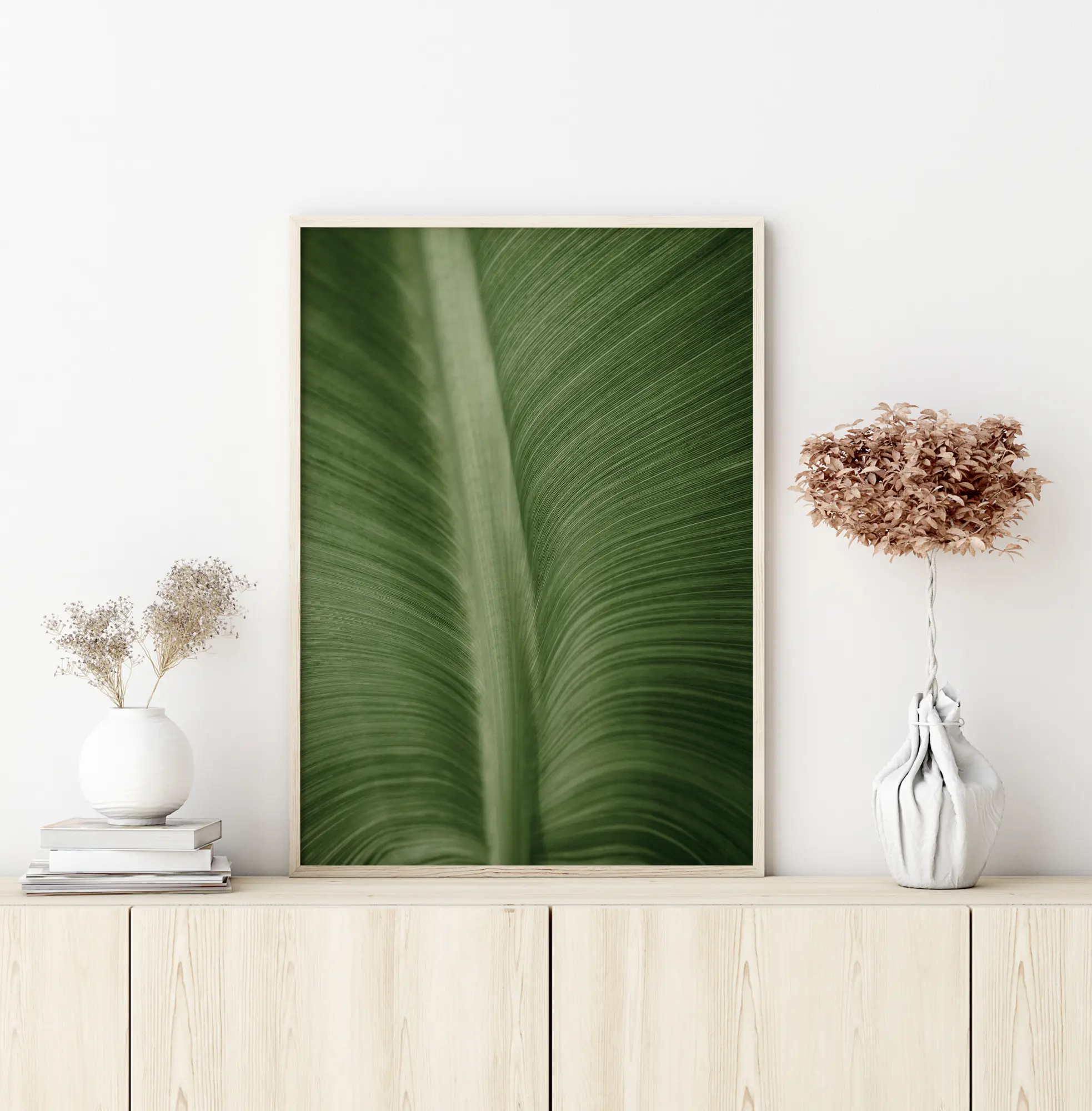 Makro plakatas su lapu, rodančiu gyslų ir kotelio struktūrą. Gražios žalios spalvos užpildo vaizdą, suteikiant itin raminantį efektą. Plonos gyslos švelniai lenkiasi į išorę nuo lapo storos ir stiprios vidurio gyslos. Pasinerkite į gamtą su šiuo stambiu planu.