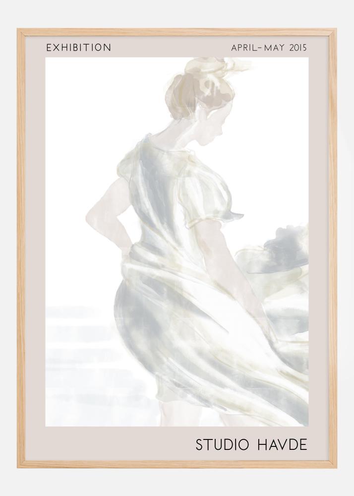 Šis elegantiškas ir erdvus plakatas iš „Studio Havde“ parodos 2015 m. balandžio-gegužės mėnesiais perteikia lengvumo ir judesio esmę. Iliustracija vaizduoja moterišką figūrą, nutapytą švelniais, akvareliniais štrichais, kuri, atrodo, grakščiai juda per drobę. Spalvos yra prislopintos ir harmoningos, su blyškiai mėlynos, kreminės baltos ir aukso spalvos užuominomis, kurios kartu sukuria amžino grožio ir elegancijos jausmą.