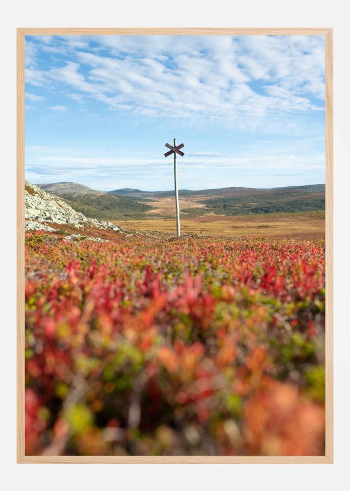 Šis nuotaikingas plakatas vaizduoja plačią kalnų peizažą su vienišu mediniu kryžiumi, kuris tampa pagrindiniu akcentu gamtos apsuptyje. Motyvas perteikia ramybės, laisvės ir šiaurietiškos laukinės gamtos pojūtį, kur žvilgsnis keliauja per atviras platybes ir švelniai banguojančias kalvas. Tai puikus pasirinkimas tiems, kurie mėgsta gamtos motyvus, kalnus, žygius ir skandinavišką estetiką, norintiems namuose sukurti harmoningą ir natūralią atmosferą.