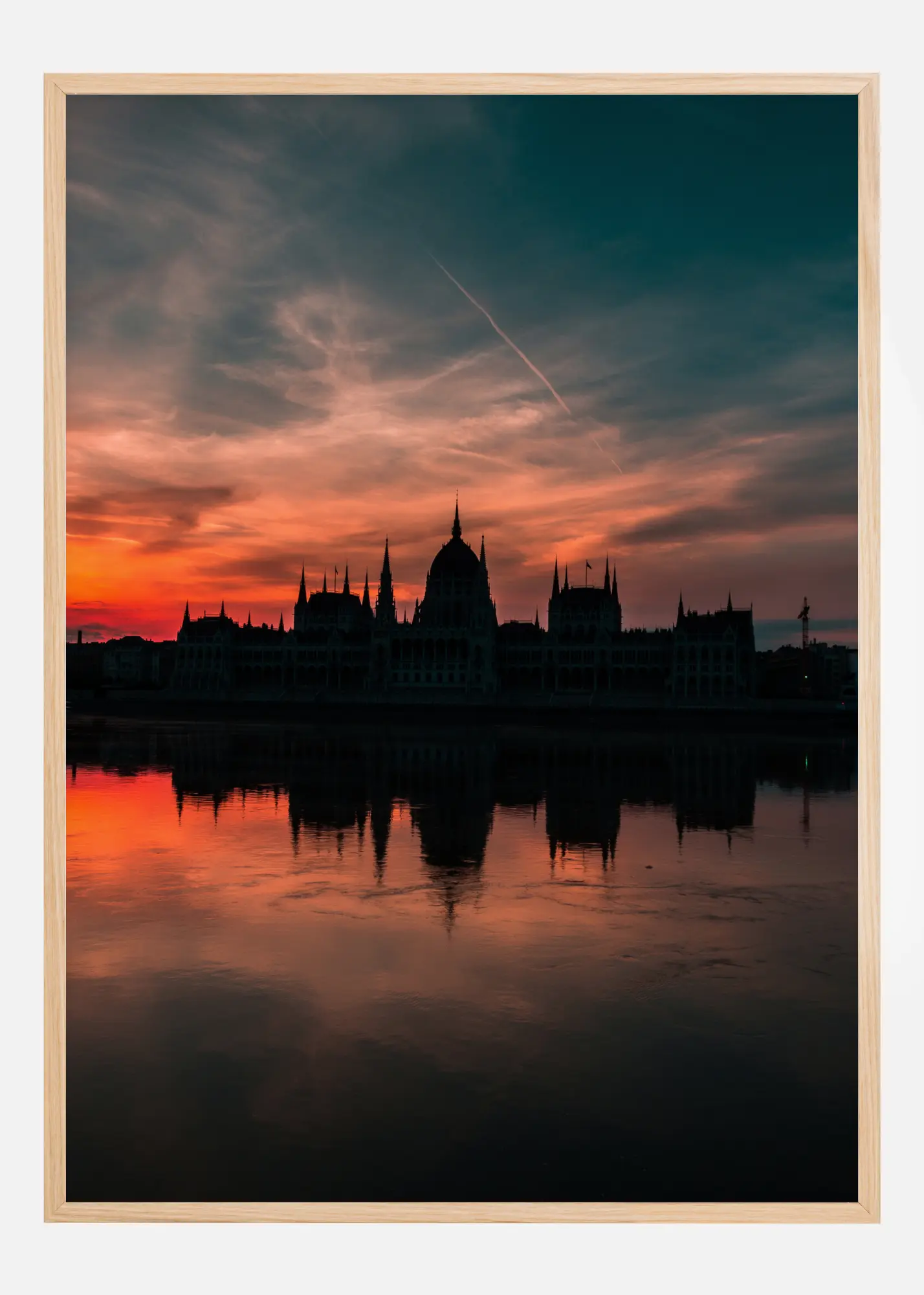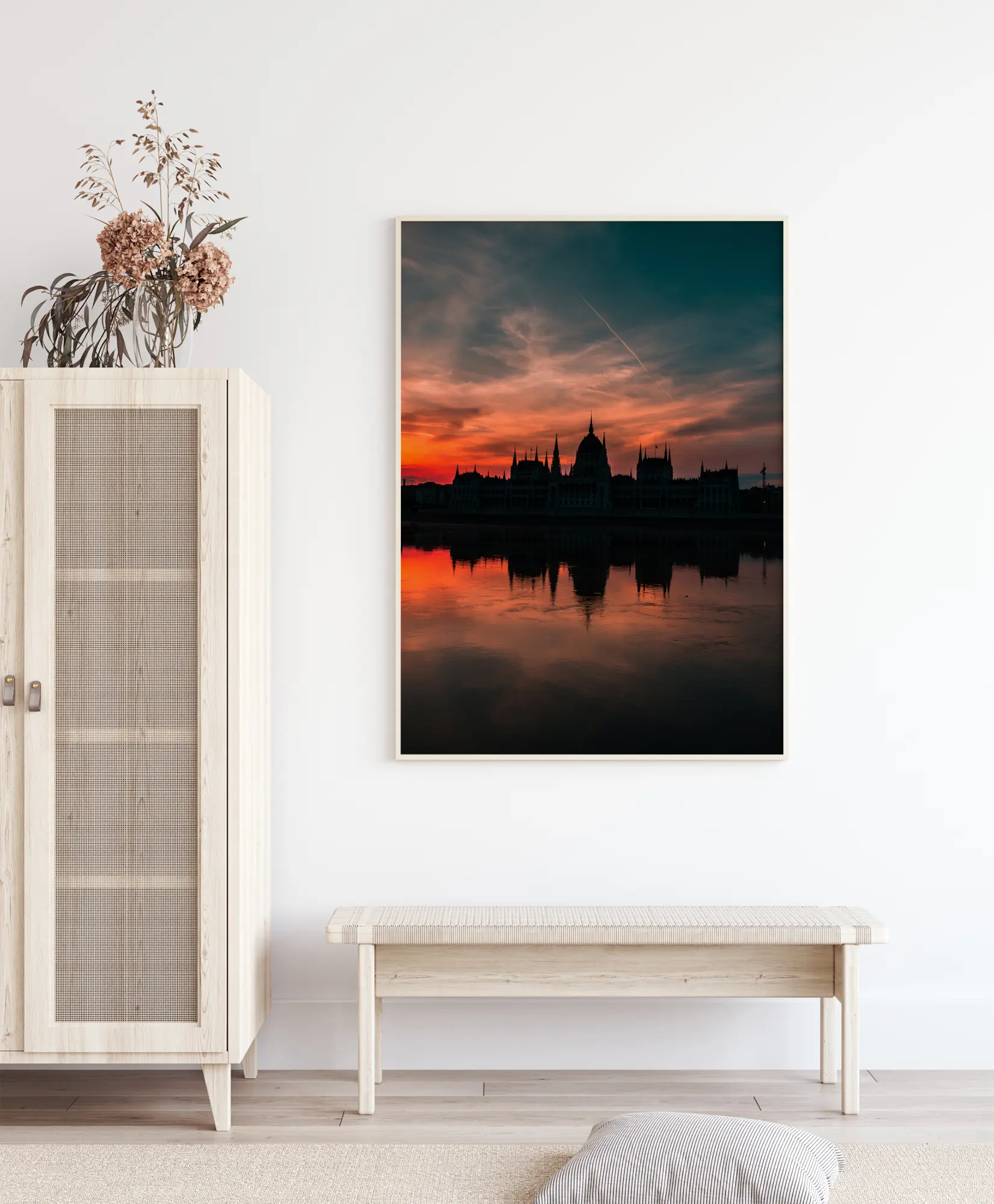 Saulėlydžio plakatas su miestu, atsiveriančiu į didelį vandens plotą. Ryškus juodas miesto bokštų siluetas atsispindi vandenyje. Už jo šviečia nuostabus raudonas saulėlydis, apšviečiantis dangų ir suteikiantis dramatišką apšvietimą vandeniui ir miestui.