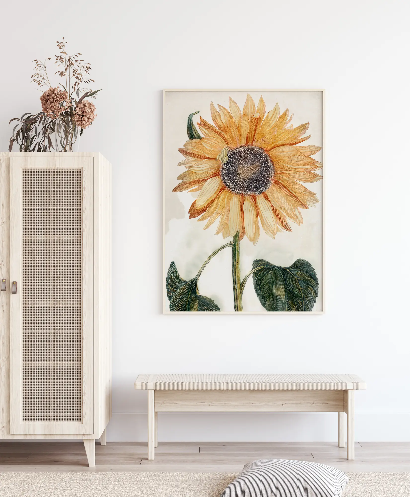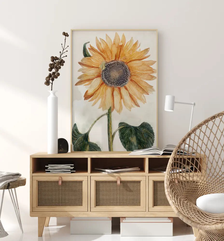 Įmantri plakata su stambiu planu piešta saulėgrąža. Dideli geltoni ir oranžiniai žiedlapiai šviečia šio nuostabaus kūrinio centre. Gėlės centre galima matyti mažas piestelių detales. Dideli žali lapai užpildo likusį vaizdą ir palaiko šį spalvingą bei linksmą gėlę.
