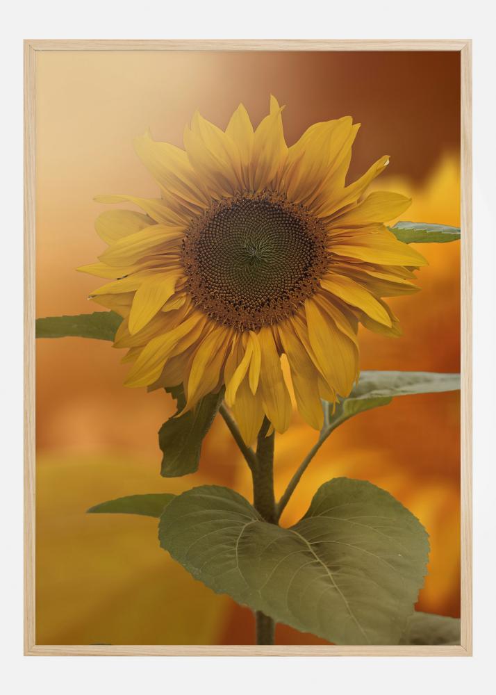 Klasikinis plakatas su stikliniu buteliu ir saulėgrąžos galva. Apgaubtas minkštu išsiliejimu, šis kadras yra švelnus ir ramus. Geltoni žiedlapiai švelniai sulinksta, kai žiedas ilsisi ant lentynos. Pakabinkite šį švelnų pastelinių spalvų atspaudą ant neutralios sienos, kad sukurtumėte ramią atmosferą.