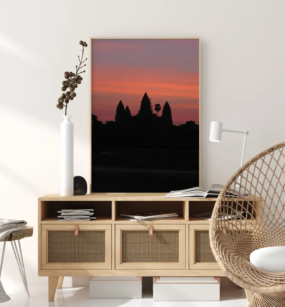 Plakatas su saulėlydžiu, kur saulė leidžiasi už Angkor Wat Kambodžoje. Unikalūs ir išskirtiniai Angkor Wat bokštai matomi ryškioje siluetoje priešais nuostabų raudonos ir violetinės spalvos dangų, kai saulė leidžiasi už jų. Aplankykite šią nuostabią vietą, net neišėję iš namų.