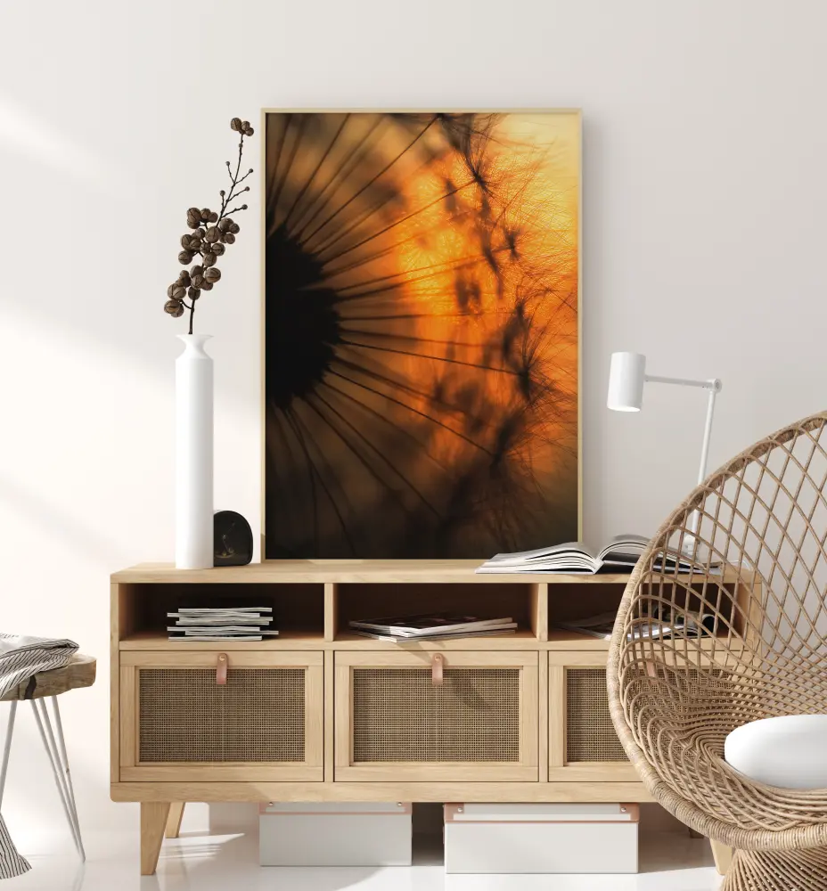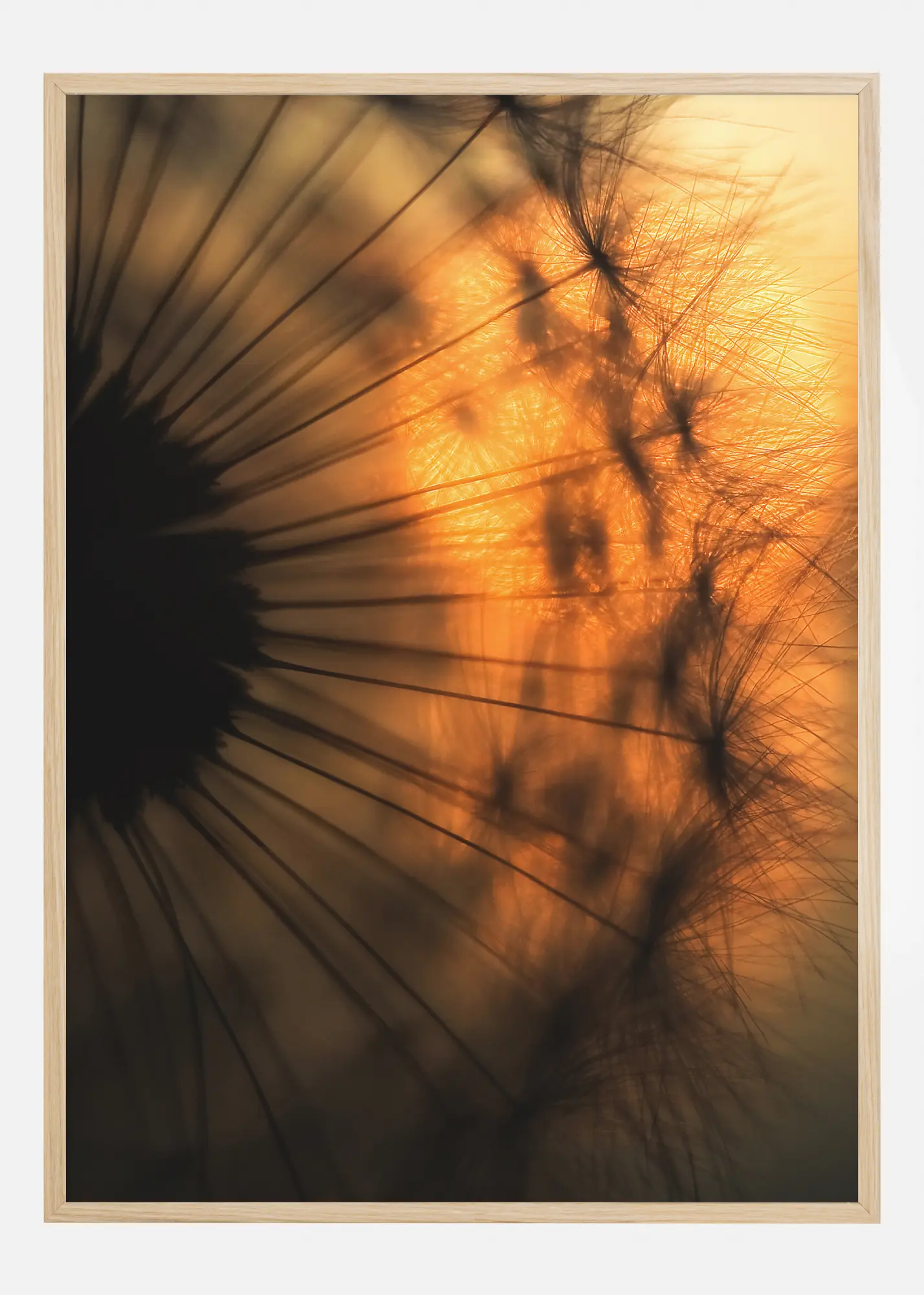 Artimos nuotolio plakatas su kiaulpienės laikrodžiu prieš šviesiai raudoną saulėlydį. Saulės šviesiai oranžiniai tonai yra nutildyti dėl didelės kiaulpienės galvos, kuri atspindi saulės masyvų formą, vos matomą per sėklas šiame epiniame spaudinyje.