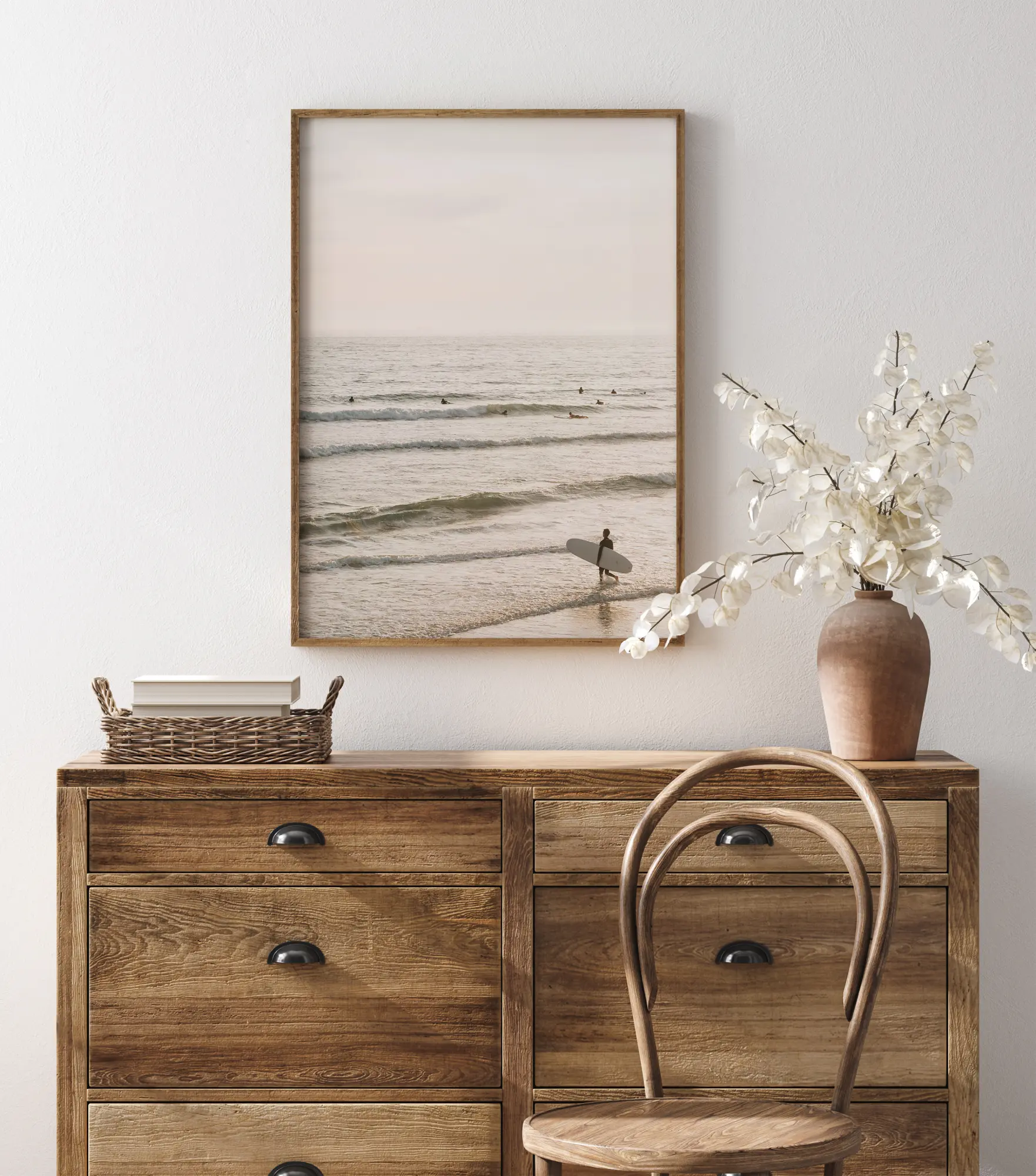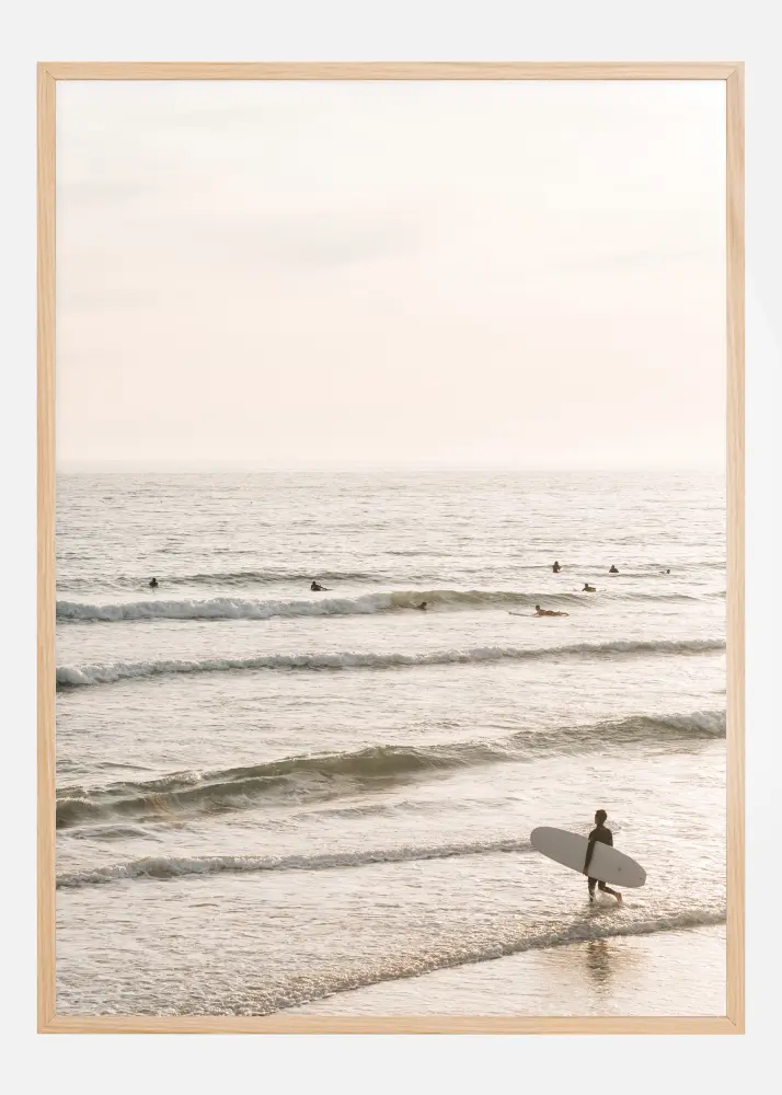Plakatas su plačia jūra, pilna banglentininkų, laukiančių kitos didelės bangos. Mažos galvos kyšo toli jūroje, o paskutinis banglentininkas eina su savo lenta į bangas. Jūra rami minkšto ryto šviesoje, o ore jaučiama laukimo pojūtis.