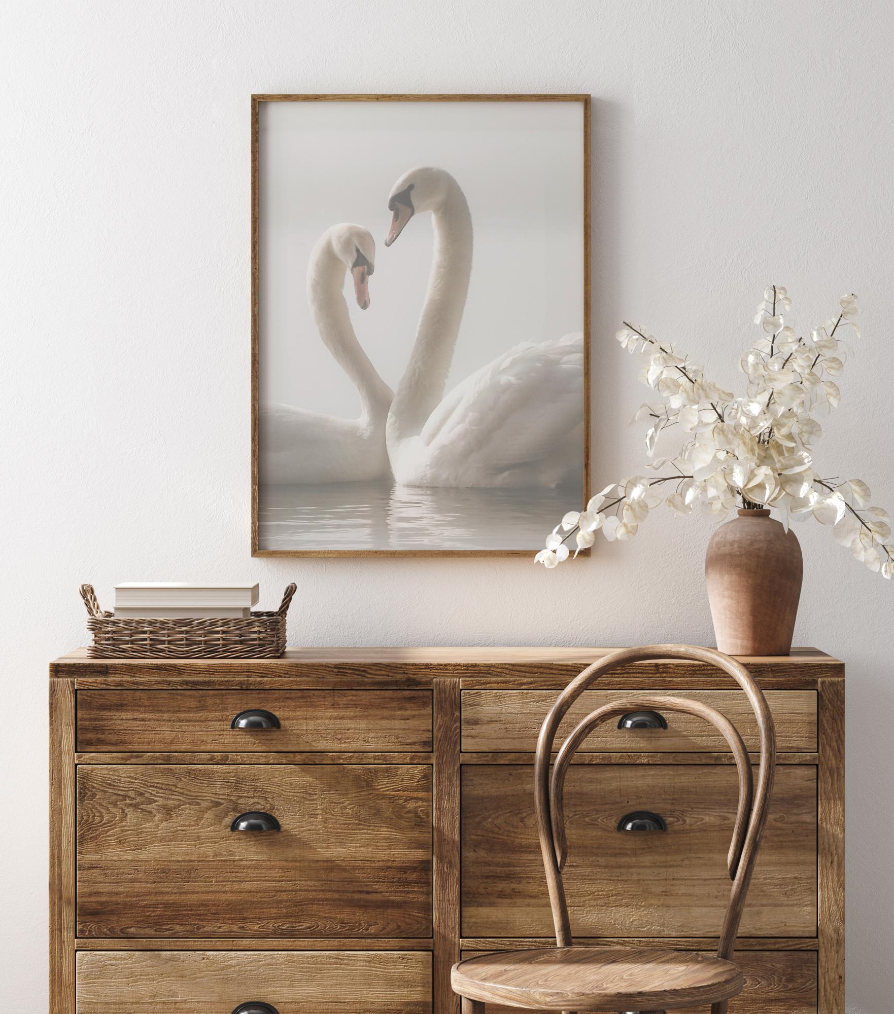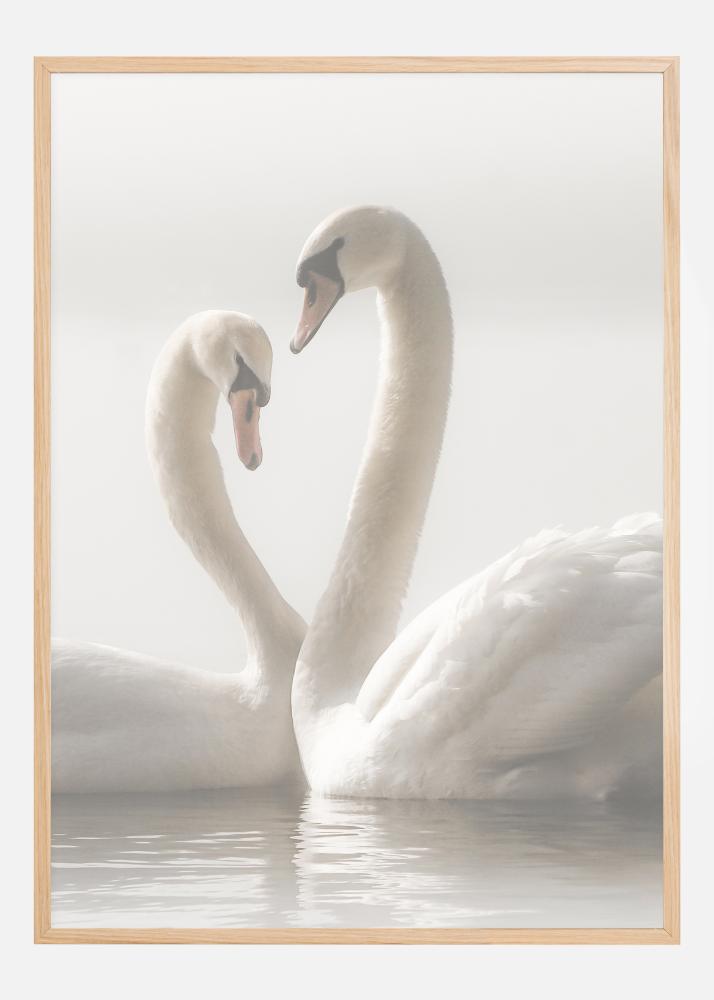 Romantiškas plakatas su dviem gulbėmis, plaukiančiomis kartu. Švelnus apšvietimas suteikia harmoningą ramybę šiam vaizdui, kuriame gulbės slysta viena link kitos. Jų kaklai pakyla ir sukuria širdies formą. Pajuskite meilę šioje žavingoje nuotraukoje.