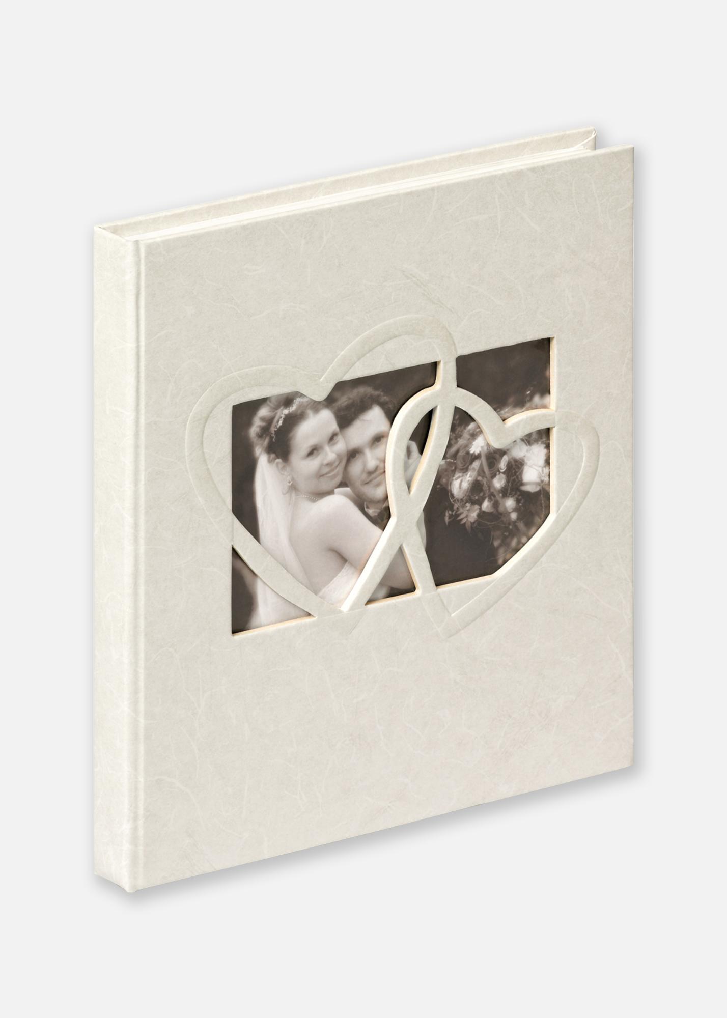Romantiška svečio knyga vestuvėms su gražiais drobės viršeliais, išraižytais širdies formos raštais. Priekyje taip pat yra vietos savo nuotraukai.