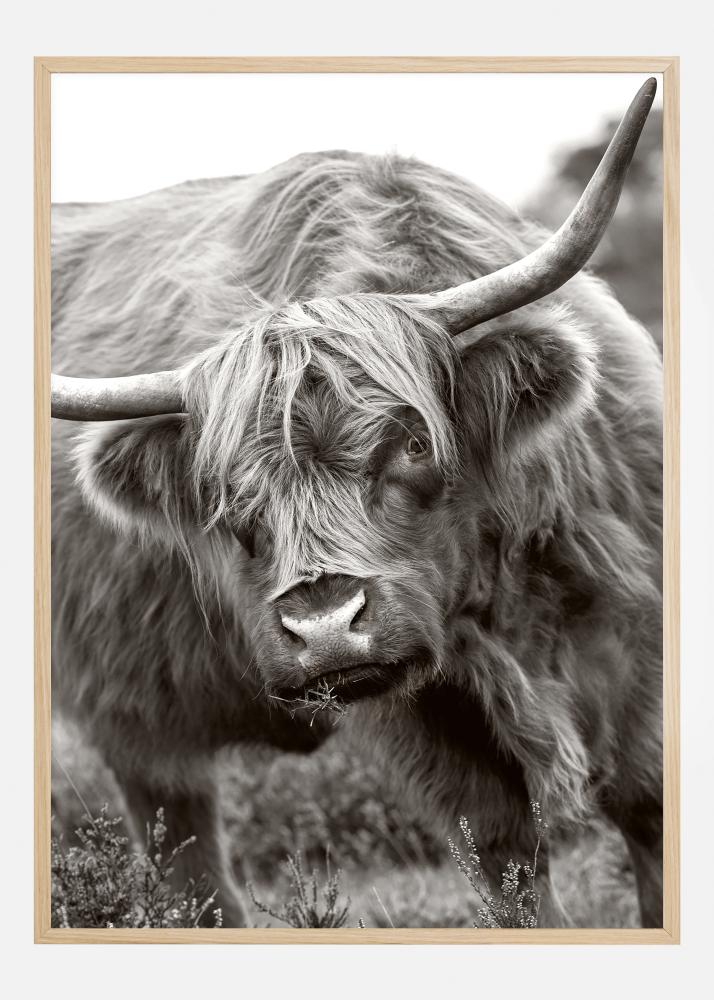 Gyvūnų plakatas su aukštikalnių jaučiu. Jautis lenkiasi į paveikslą, o kailis krenta virš akių. Viena akis žiūri į kamerą, o jos minkštas, pūkuotas kailis pagauna šviesą, kai juda. Nepaisant ragų, gyvūno veidas yra švelnus ir žavingas, beveik galima pajusti jo drėgną nosį.