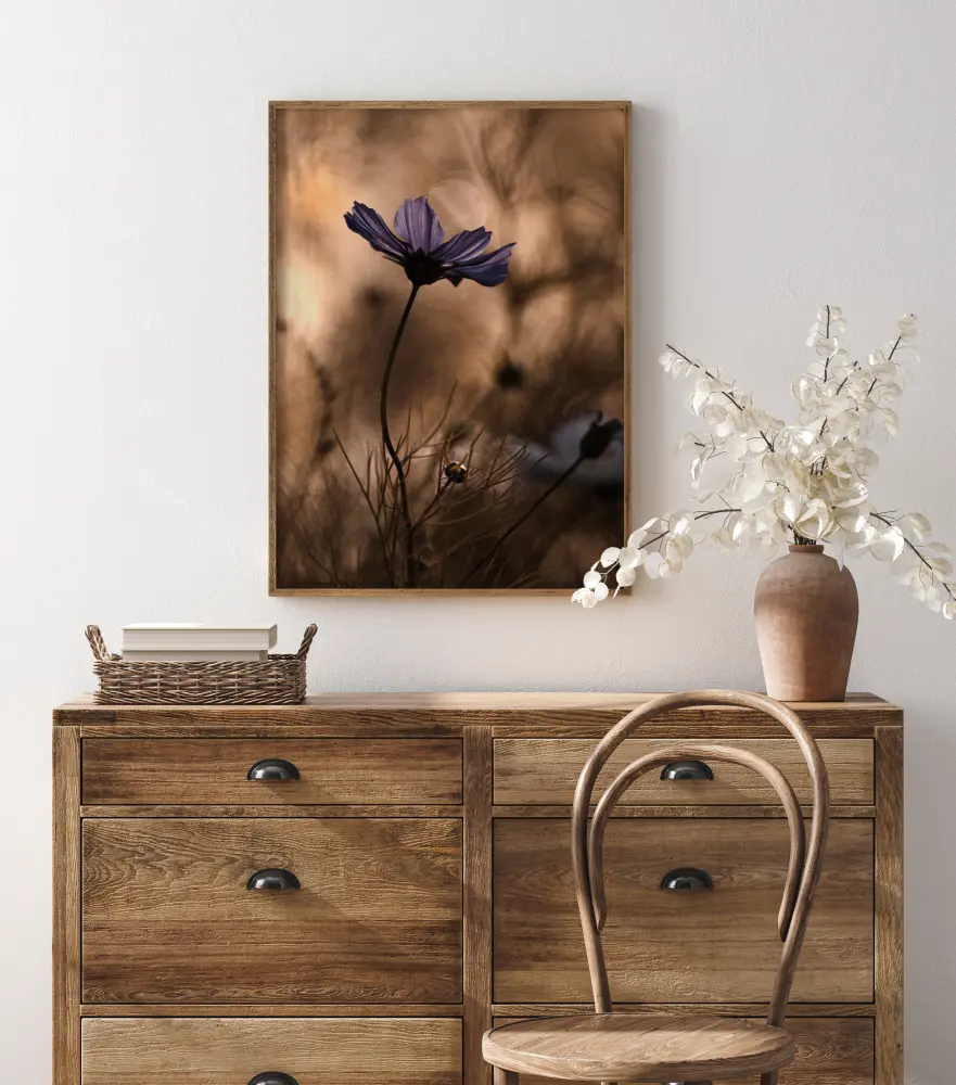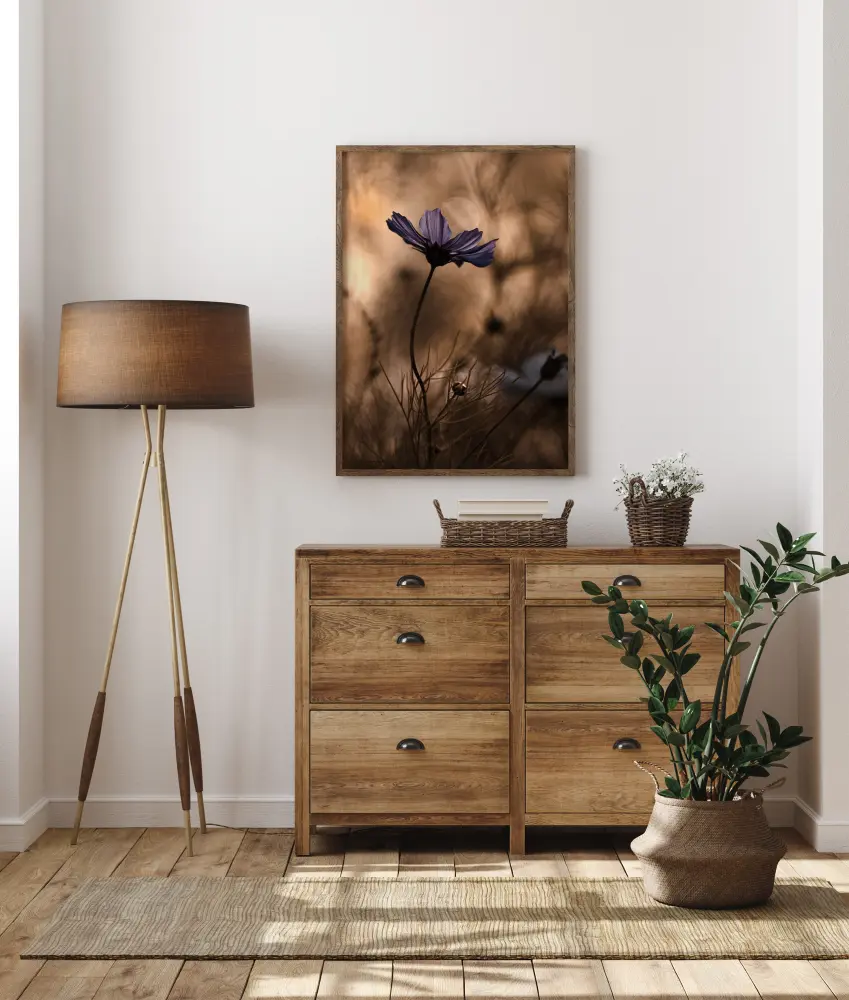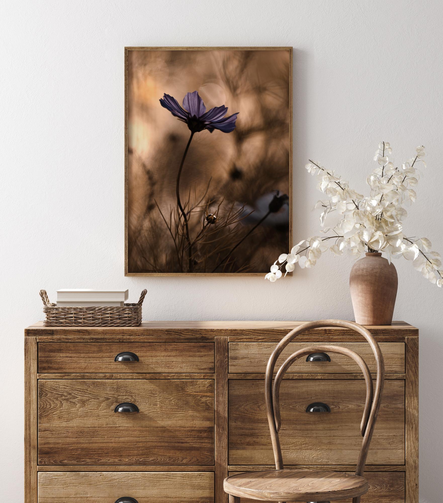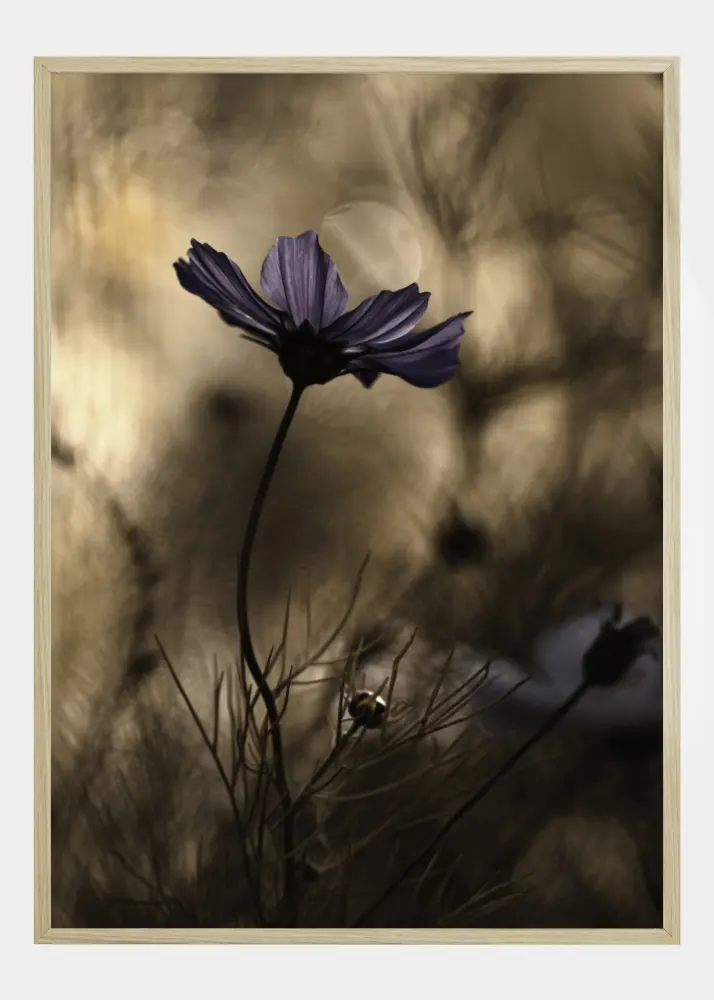 Gėlių plakatas su šviesiai violetine gėle, linguojančia prieš minkštą rudą foną. Violetiniai žiedlapiai dramatiškai išsiskiria prieš nefokusuotus augalus fone. Kitos formos matomos, kai žvilgsnis slysta išilgai lenktų stiebų, kad apimtų visą paveikslą.