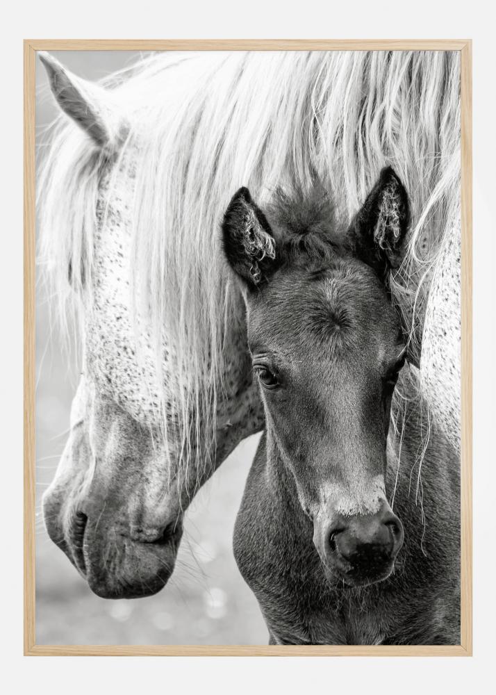 Gyvūnų plakatas su kumelė ir jos kumeliuku. Kumelė saugo savo kumeliuką ir lenkia savo baltą galvą per jo nugarą. Tamsiai spalvotas kumeliukas žiūri į kamerą iš šios priedangos, su ausimis, užsmailintomis iš smalsumo. Mėgaukitės šia miela kūdikiška nuotrauka.