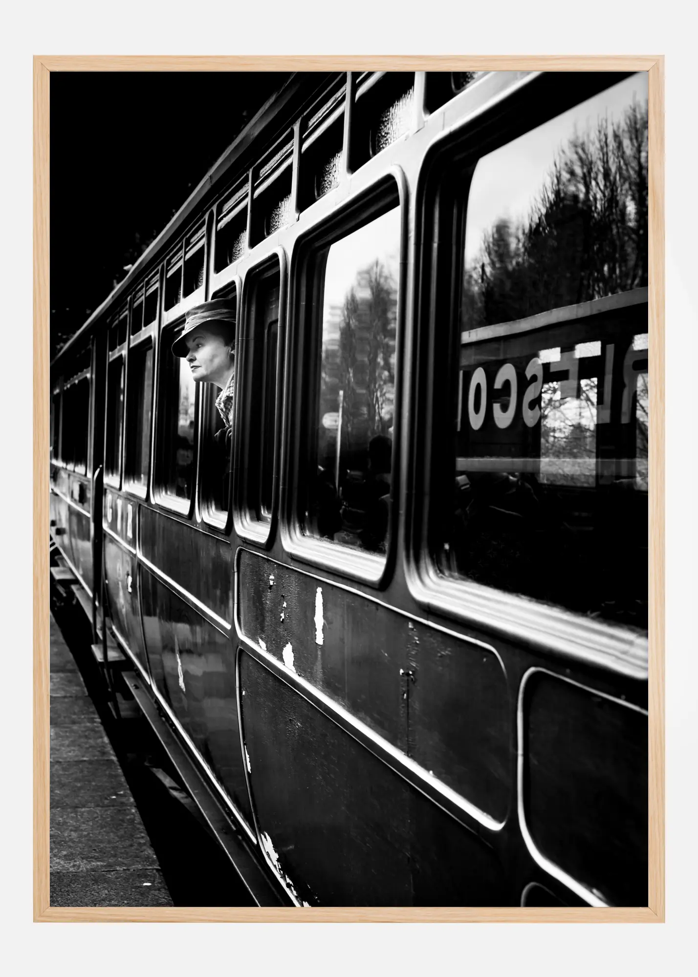 Ši sugestyvi juodai balta plakatas užfiksuoja nostalgišką akimirkos vaizdą žmogaus, žiūrinčio pro traukinio langą. Asmuo, apsirengęs klasikine kepure, suteikia vaizdui nesenstančio pojūtį, o atspindžiai ir kontrastai sukuria dramatišką ir emocingą atmosferą. Veidrodinis traukinio paviršius ir tamsios kontūrai prisideda prie judėjimo ir pasikeitimų pojūčio.