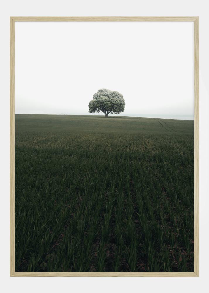 Šis plakatas pristato vienišą ąžuolą, kylantį iš vešlios dirvos, su švelnia rūku, kuris apgaubia kraštovaizdį. Medžio didinga forma stovi kaip natūrali skulptūra prieš švelnią šviesą, suteikiančią stiprų vizualinį kontrastą su linijiniais pasėlių raštais priešakyje. Bendras žalias atspalvis papildytas šiltos rudos ir subtilių raudonų tonų elementais, kurie prideda gylį ir sudėtingumą vaizdui.