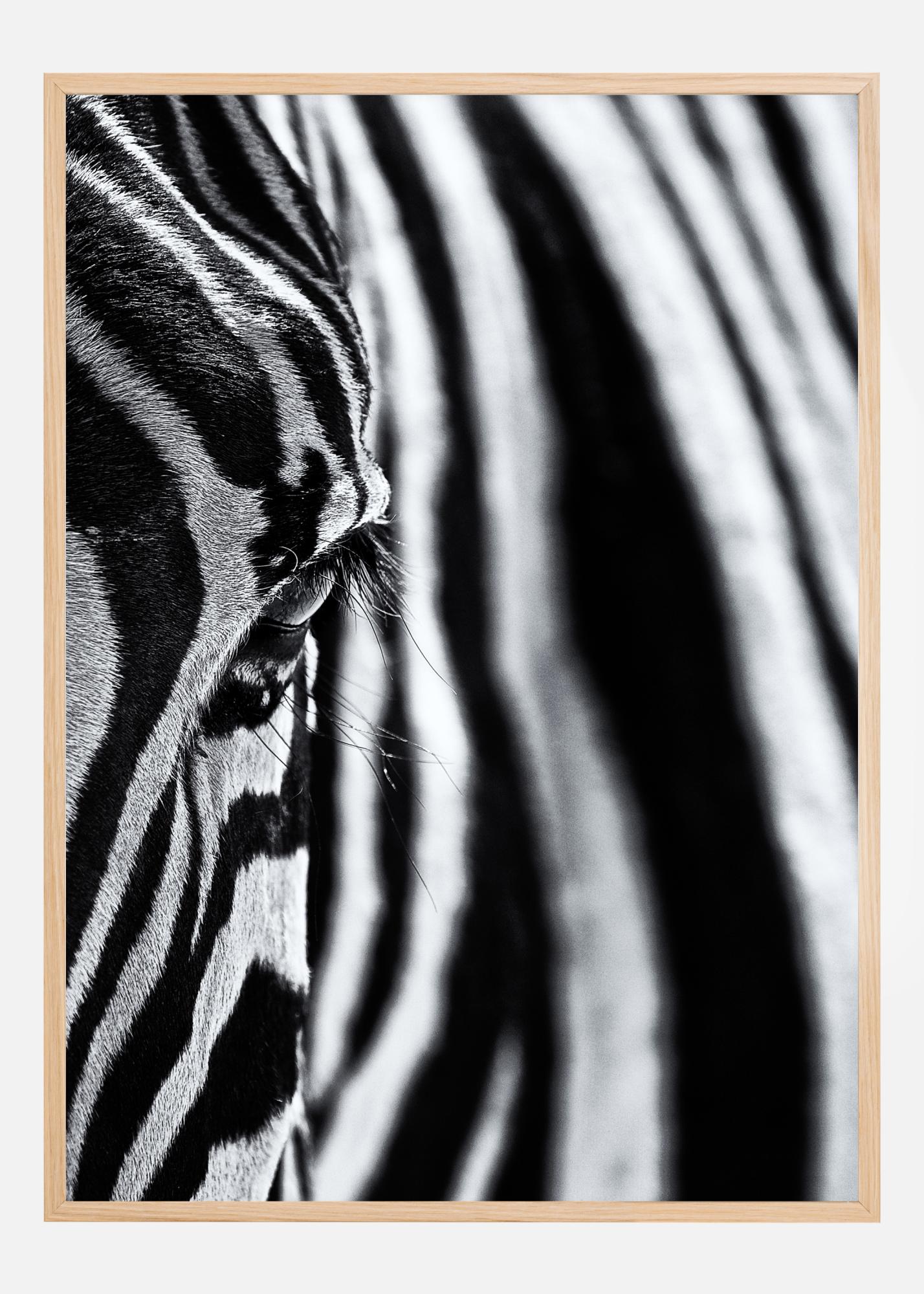 Arti vaizdas iš zebros veido šono. Storos juodos ir baltos juostos sukuria nuostabias geometrines formas, kurios nukreipia žvilgsnį. Zebros akis ir jos blakstienos padaro vaizdą šiek tiek švelnesnį. Pakabinkite jį ant baltos sienos, kad išlaikytumėte stiprų juodai-baltą efektą.