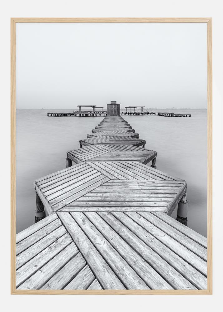Linksmas plakatas su šešiakampe lieptu, einančiu link tolimo horizonto per ramią ežerą. Vaizdas atspalvio pilkos spalvos, todėl atrodo šaltas, o ne šiltas. Medinis lieptas veda jus į tolį, kur jūsų laukia tiltelis. Derinkite su šviesia spalva, kad suteiktumėte šilumą.