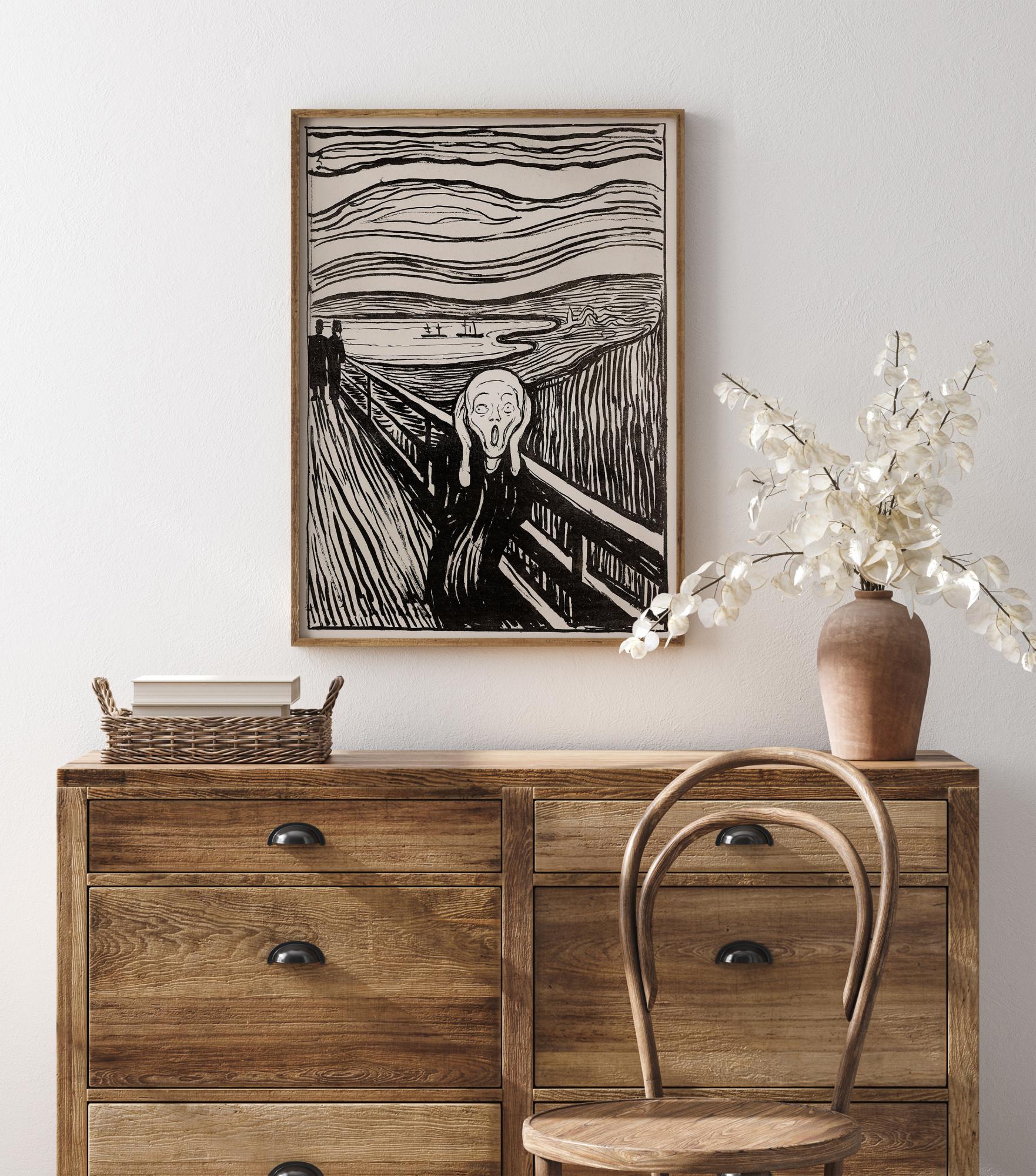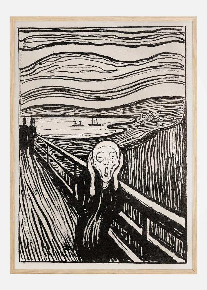 Abstrakti ekspresionistinė Edvardo Munko „Šauksmas“ juodai balta plakatas. Tai ikoniškas juodai baltas atspaudas, kurį visi iš karto atpažįsta, sutelkiant dėmesį į šaukiančią baltą veidą žmogaus ant tilto. Parodykite savo meno žinias su šiuo klasikiniu vaizdu ant spalvingos sienos namuose.