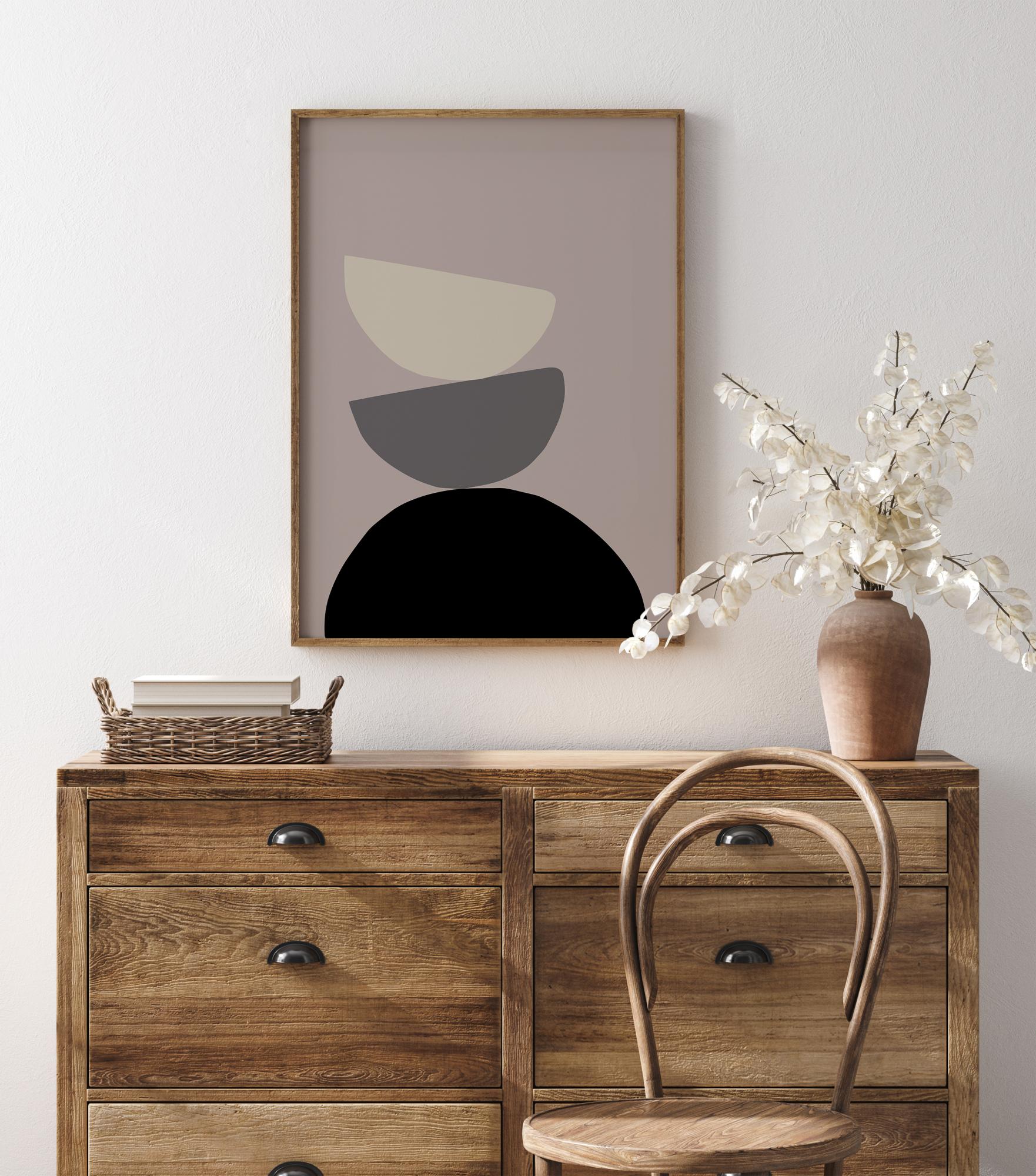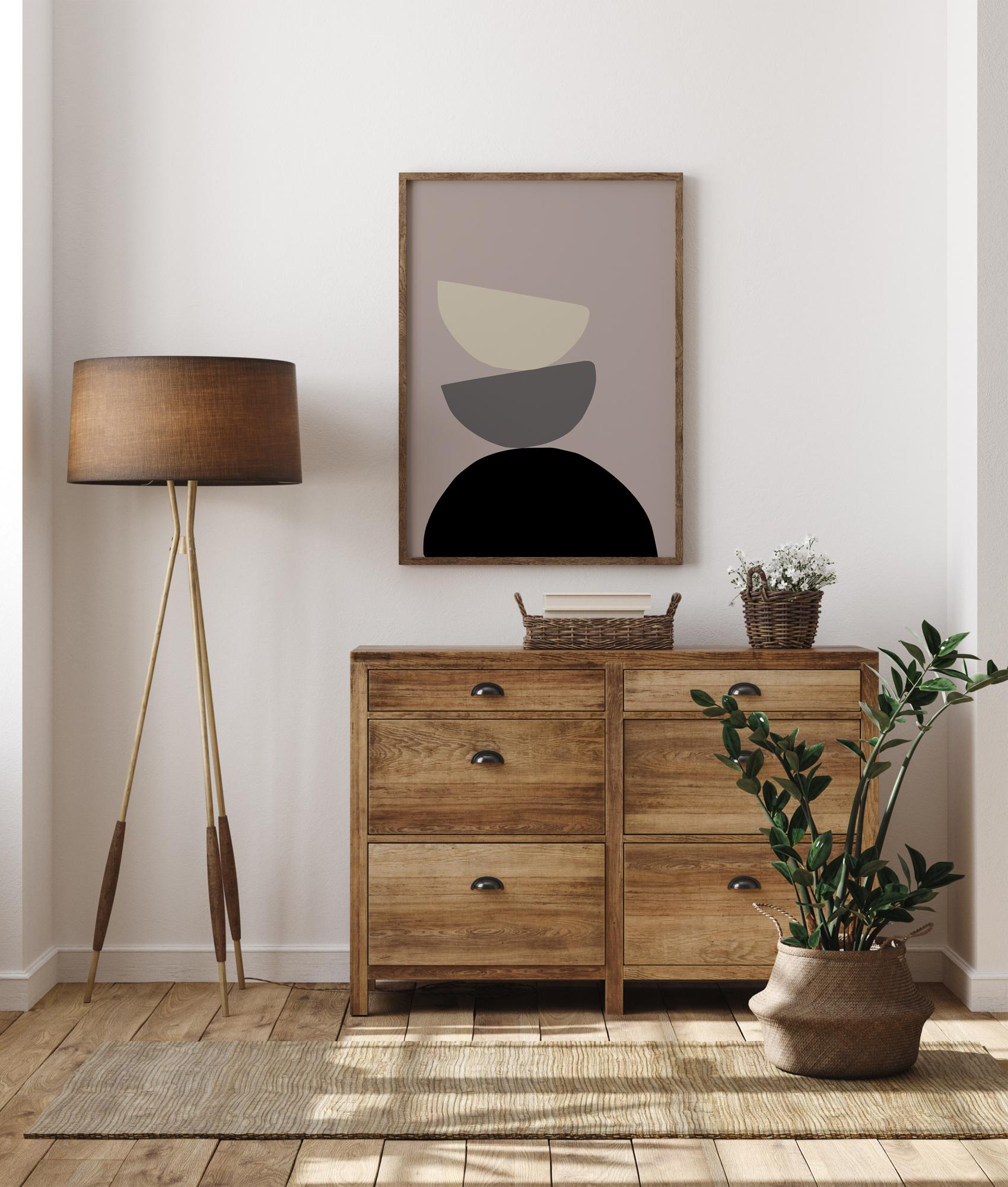 Abstraktus plakatas su trimis puslankiais, sukrautas vienas ant kito pilkame fone. Didelis juodas puslankis yra apačioje, vidutiniškai pilkas puslankis balansuoja viršuje kartu laikydamas baltą puslankį aukščiau. Suteikite vėsų įspūdį ant mėlynos sienos arba šiltesnį įspūdį ant smėlio arba kreminės spalvos.