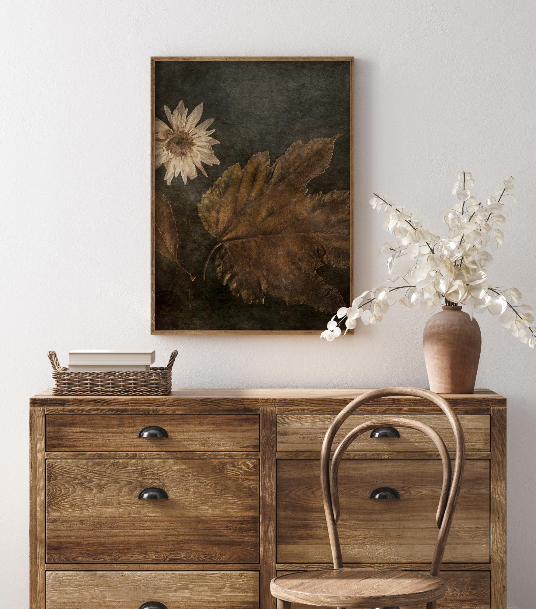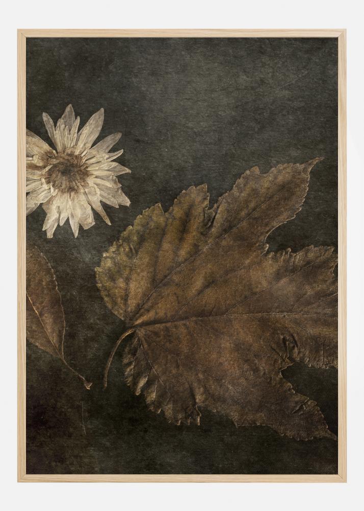 Gėlių plakatas su paprasta gėle su dviem lapais. Balta žvaigždės formos gėlė pritraukia dėmesį, išsiskirianti ant tamsiai pilko fono. Du rudi rudens lapai ją flankuoja, vienas paprastas ovalus ir kitas sudėtingesnis figos lapas. Atidžiai pažvelkite, kad pamatytumėte lapų ir žiedlapių detales šiame nuostabiame botanikos spaudoje.