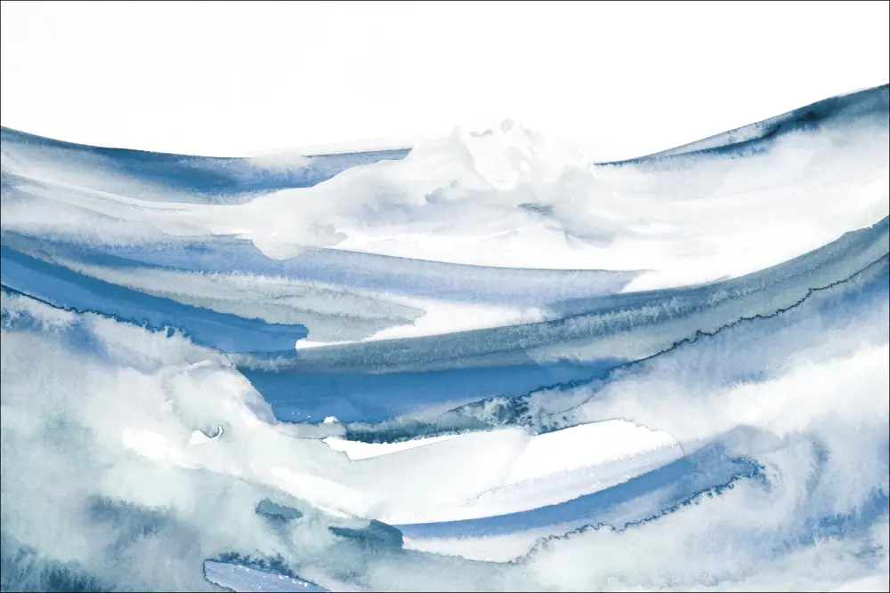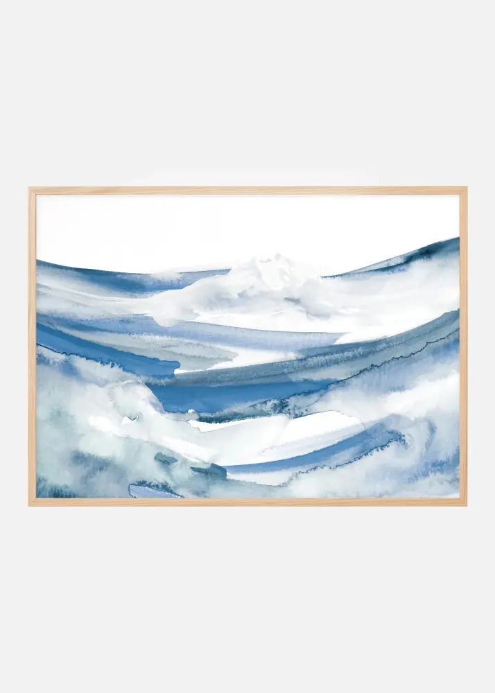 Nuostabus šviesos plakatas su dideliais potepiais mėlyna ir balta spalvomis. Šios dramatiškos spalvų juostos sukuria bangų iliuziją jūroje. Švelnūs akvarelės kraštai sukuria putas ir suteikia kūriniui stiprų greičio pojūtį, kai spalva sukasi aplink. Suteikite savo sienoms judėjimo pojūtį su šiuo tekalingu kūriniu.