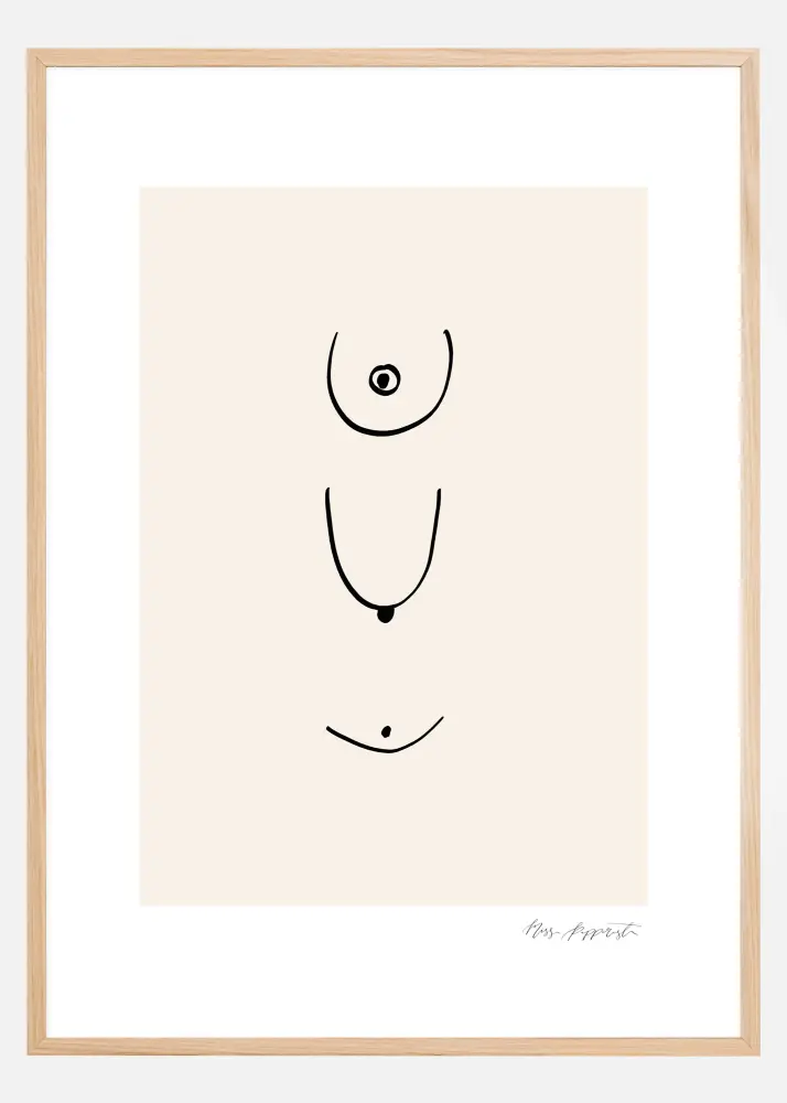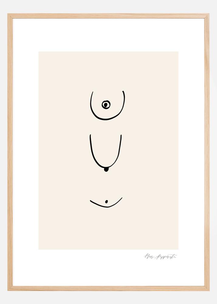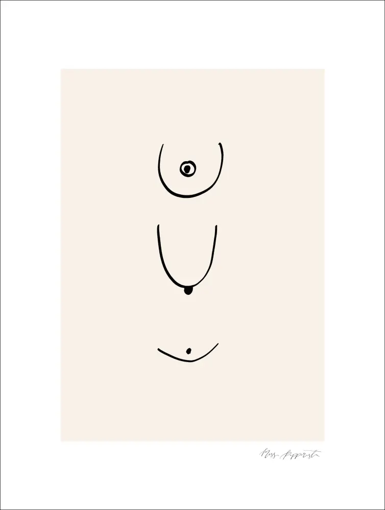 Abstraktus plakatas su įvairiomis juodomis linijomis ant balto fono. Paprastos linijos atrodo taip, tarsi vaizduoja moters krūtinę skirtingose pozicijose ir iš skirtingų kampų. Linijos yra paprastos ir elegantiškos. Matykite tai, ką norite matyti šiose išlenktose formose ir taškuose.