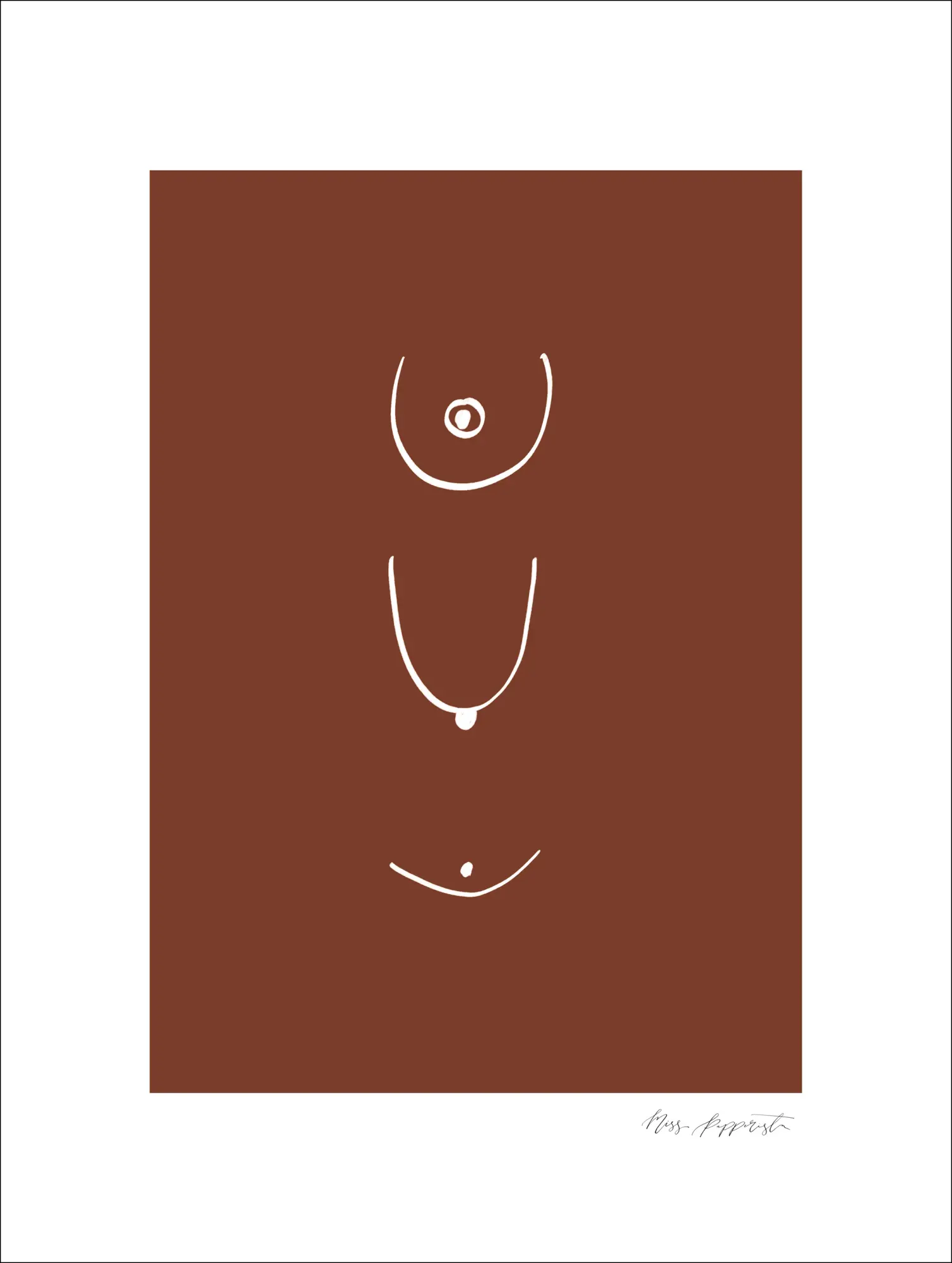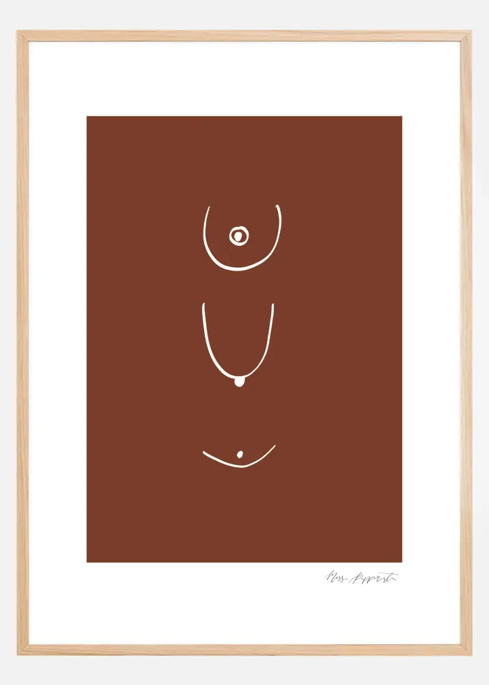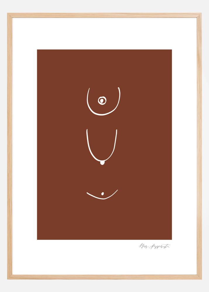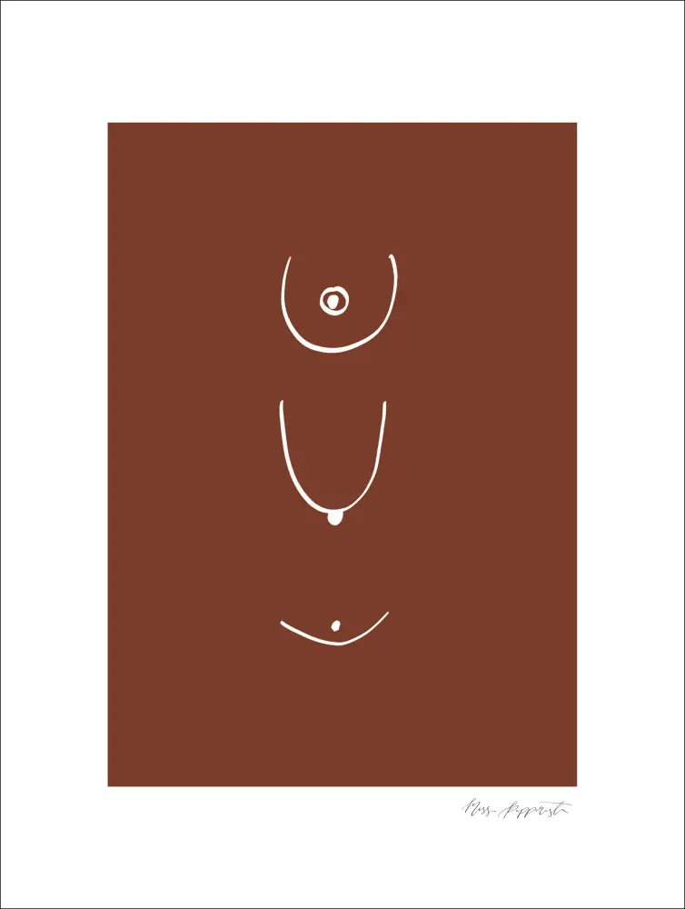 Abstraktus plakatas su baltomis išlenktomis linijomis ir taškais ant paprasto rudo fono. Linijos gali būti interpretuojamos kaip norima, tačiau jos atrodo kaip moterų krūtys, pieštos iš skirtingų kampų. Mėgaukitės šiek tiek keistu šio paprasto vaizdo pobūdžiu.