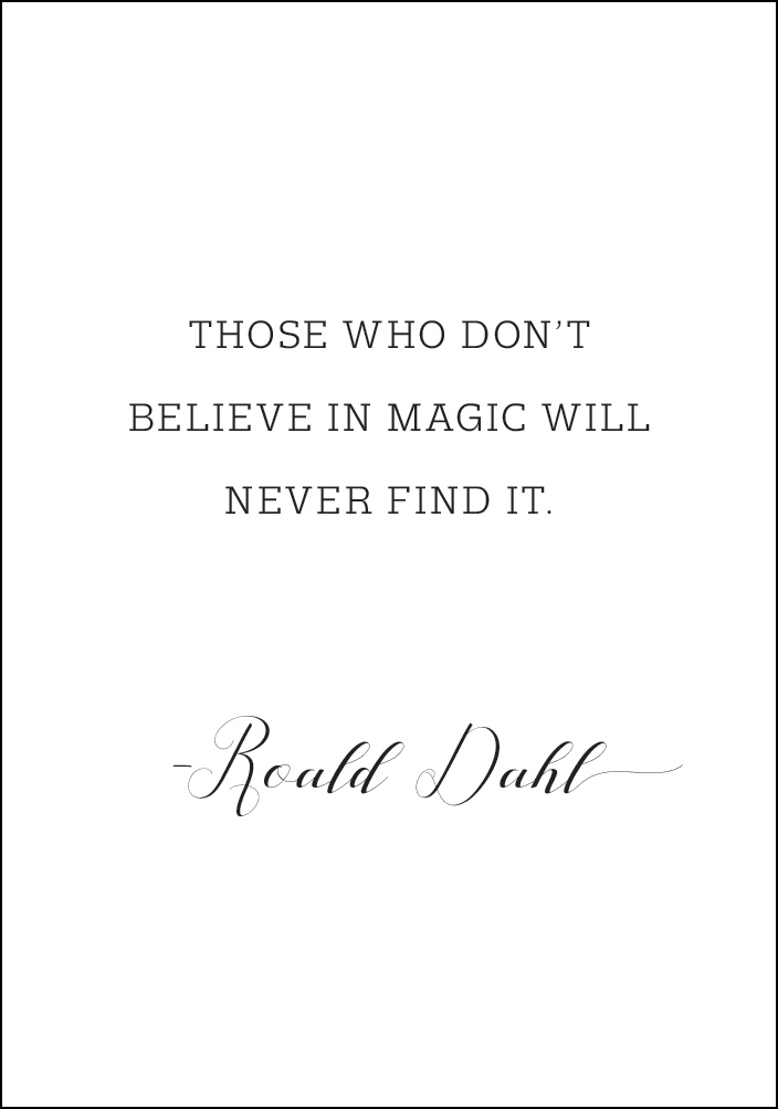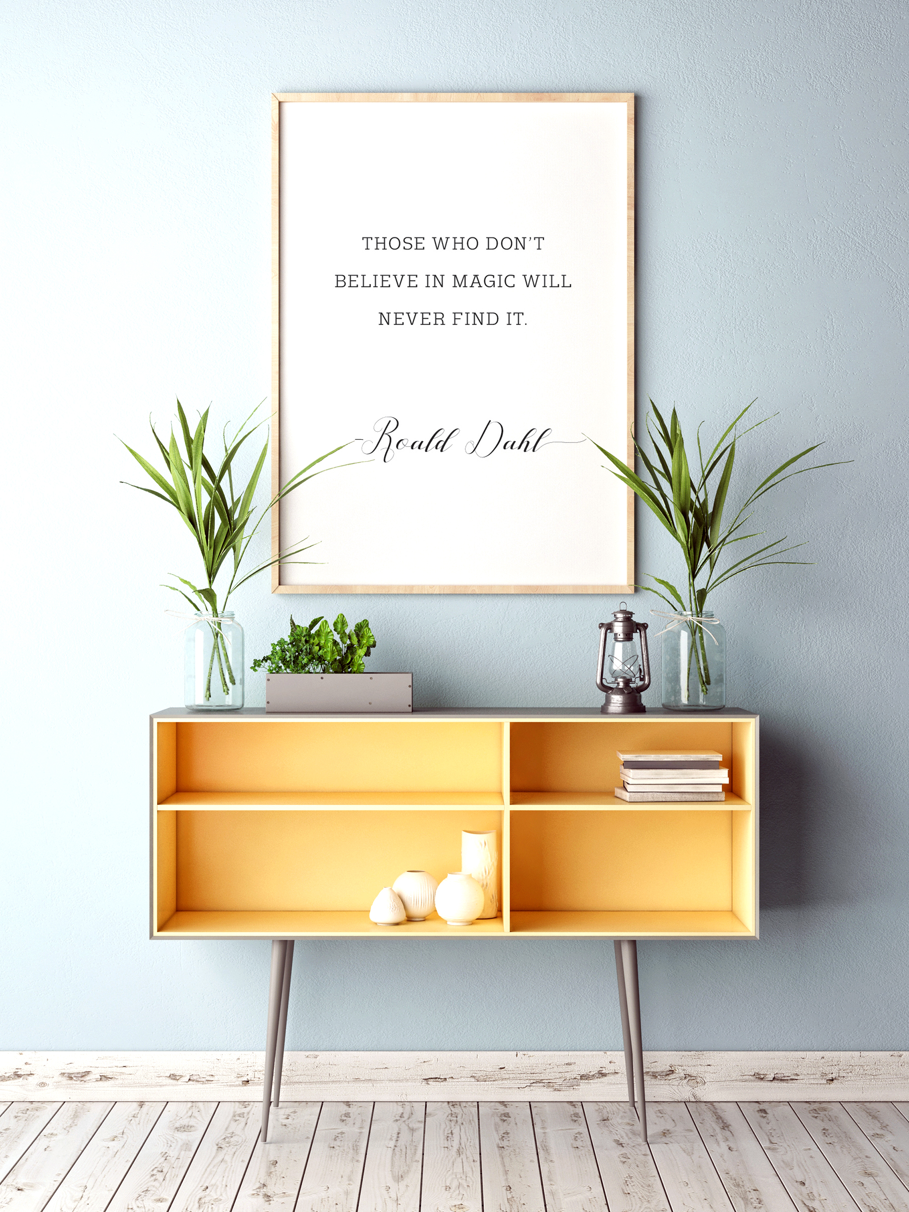 Linksmas įkvepiantis plakatas su garsiąja autoriaus Roald Dahl citata. Citatą „Those Who Don't Believe in Magic Will Never Find It“ parašyta lengvai įskaitomu rašomąja mašinėle šriftu, o autoriaus vardas pateiktas kursyvu apačioje. Paprasta frazė juoda spalva išsiskiria baltame fone ir primena gyventi kiekvieną dieną.