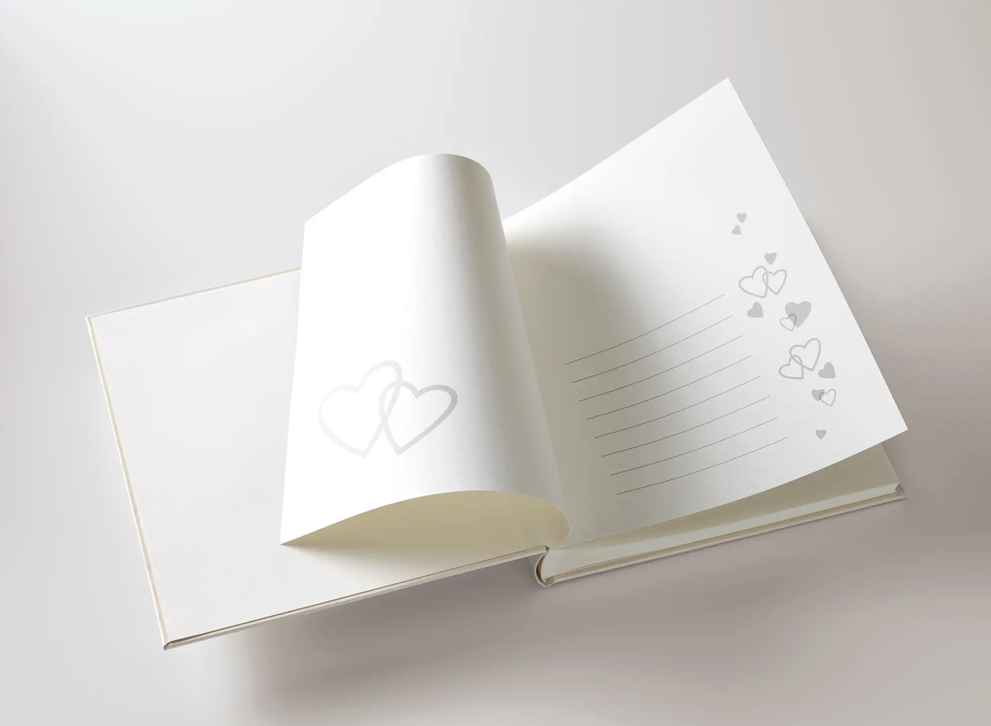 Graži vestuvių nuotraukų albumas, kurio viršeliai yra iš lino su gražiai įspaustais raštais. Albumo priekyje taip pat yra vietos asmeninei nuotraukai. Pirmieji albumo puslapiai yra gražiai iliustruoti ir turi vietos jūsų pastaboms apie didžiąją dieną. Elegantiškas pasirinkimas, jei ieškote vestuvių albumo, kuris jus džiugins ilgai.