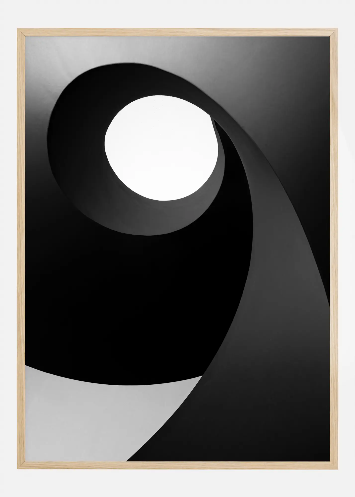 Plakatas su juodų linijų spiralėmis, kurios apšviestos balta šviesa centre. Platūs juodi juostos sukasi aplink šviesią baltą apskritimą paveikslo viršuje. Žvilgsnis vedamas aplink plakatą, kol pasiekia šį šviesiausią tašką. Pridėkite spalvų pakabinus šį plakatą ant mėlynos sienos savo koridoriuje.