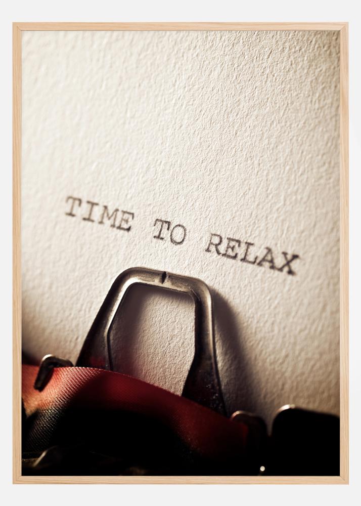 Tekstinis plakatas su žinute „Laikas atsipalaiduoti“, parašyta sena rašymo mašinėle su klasikiniu senu šriftu. Stilingas ir elegantiškas plakatas su jaukiu retro jausmu. Tinka daugeliui namų ir interjero stilių.