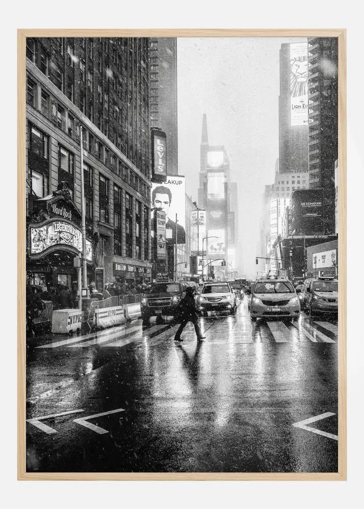 Urbaninis plakatas su Times Square Niujorke. Šioje juodai baltoje nuotraukoje žmogus kerta gatvę naktį lyjant lietui. Automobiliai laukia galimybės judėti toliau. Ryškūs reklaminiai skydeliai ir dangoraižiai matomi tolumoje, kai žiūrite žemyn gatve. Atmosfera yra juntama, beveik atrodo, kad galėtumėte būti ten patys.