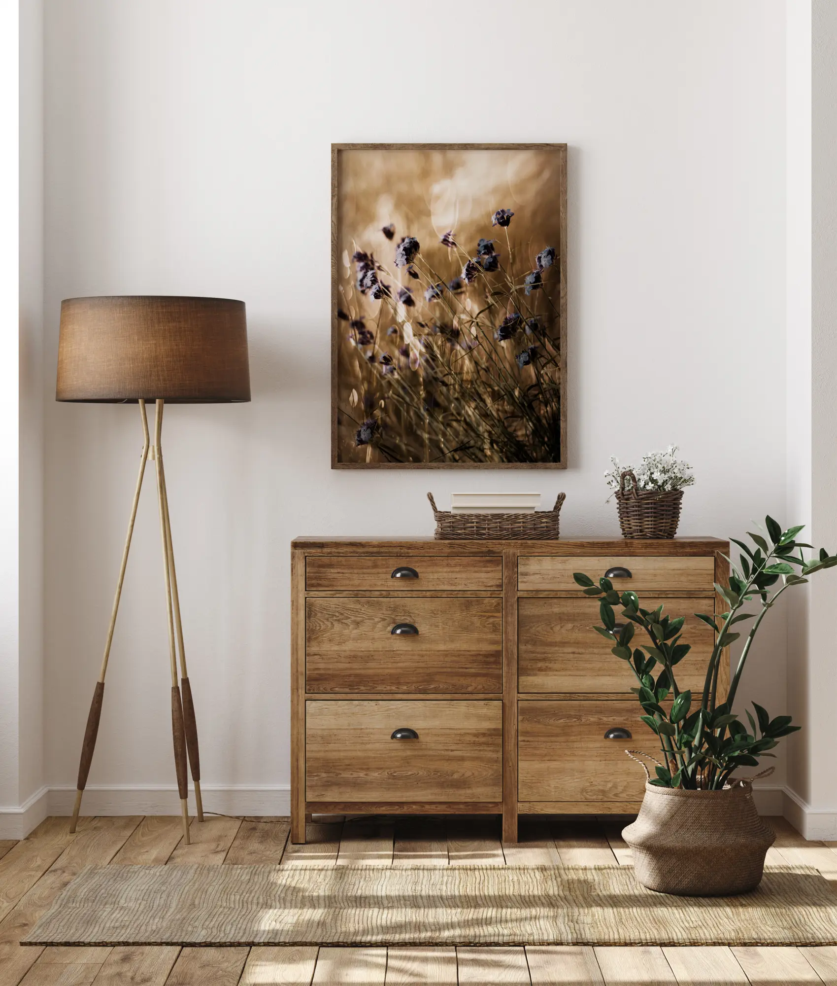 Nuostabus gamtos plakatas su mėlynomis rugiagėlėmis, besistiebiančiomis į šviesą. Mėlynos gėlės išsiskiria prieš prislopintus sepijos tonus. Žvilganti saulės šviesa suteikia ramų rytmečio ramybės pojūtį.