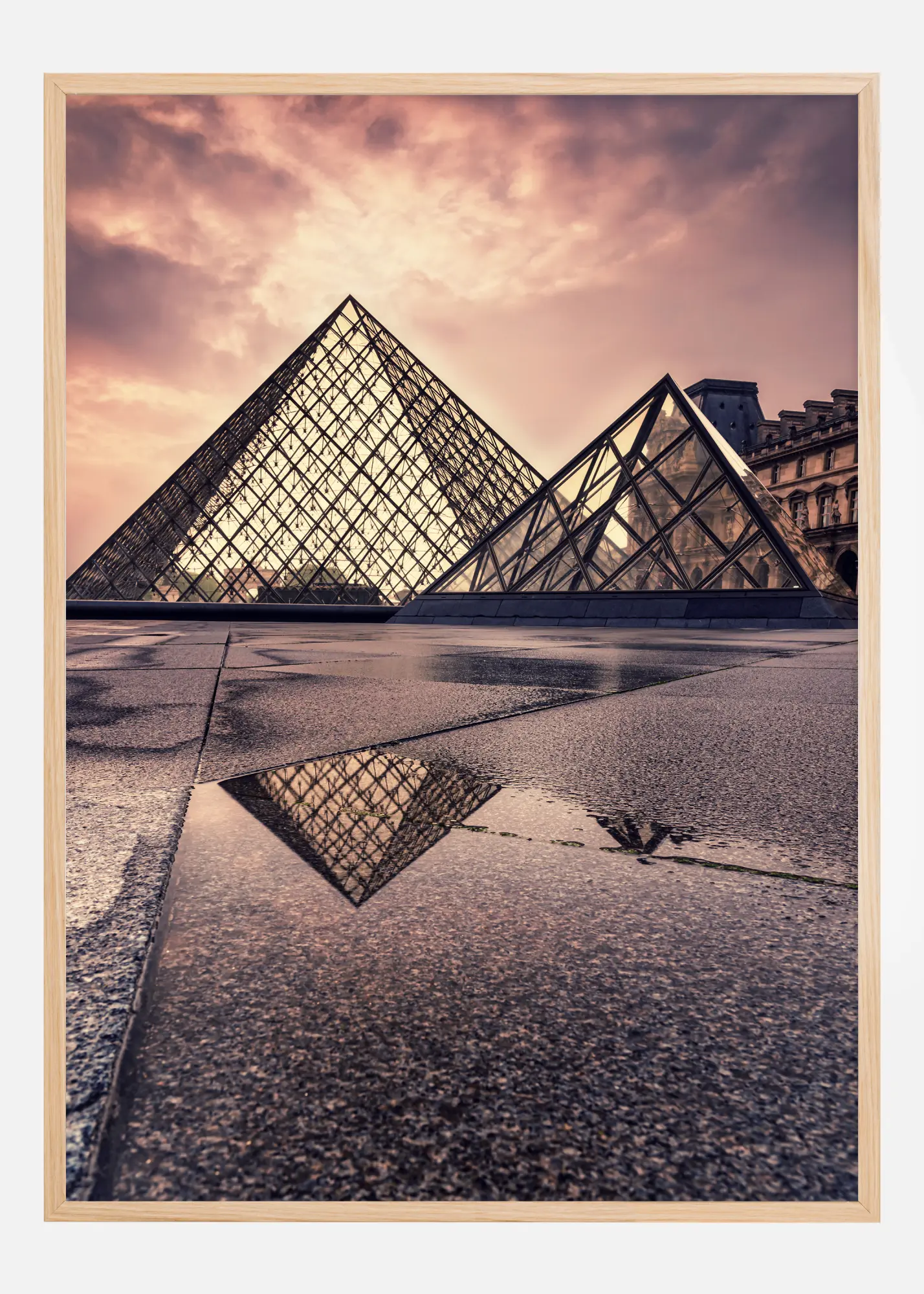 Ši moderni posteris vaizduoja garsios struktūros ikonines geometrines formas, atsispindinčias vandens baloje. Metalo blizgios trikampės ir stiklo plokštės pagaunamos drąsiu kampu, su dangumi, nudažytu švelniomis violetinės ir rožinės spalvos atspalviais, kaip paskutinė sutemų šviesa. Spalvų paletė apima nuo šaltų pilkos ir sidabrinės tonų iki šiltų varinių atspalvių, atspindėdama tiek konstrukcijos patvarumą, tiek dangaus trumpalaikį grožį.