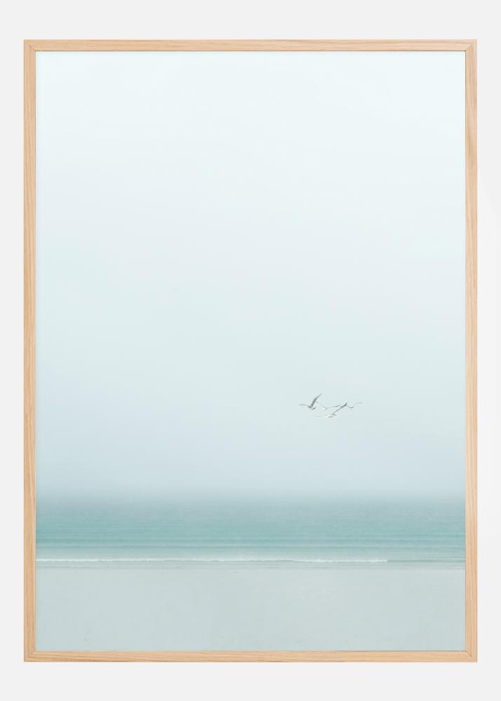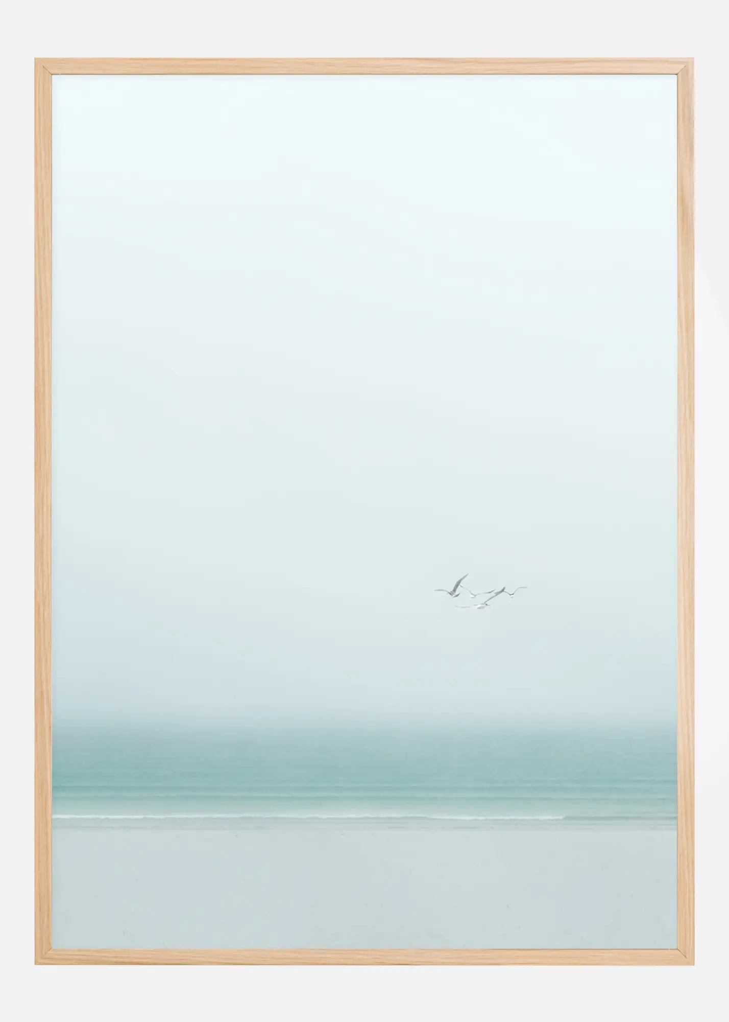 Paprastas plakatas su dviem paukščiais, skrendančiais virš jūros. Fone tiek jūra, tiek dangus yra tokie švelniai balti ir mėlyni, kad sunku pastebėti, kur prasideda vienas ir baigiasi kitas. Spalvos yra raminančios, o tik dviejų paukščių judėjimas pritraukia akį šiame elegantiškame, bet paprastame plakate.