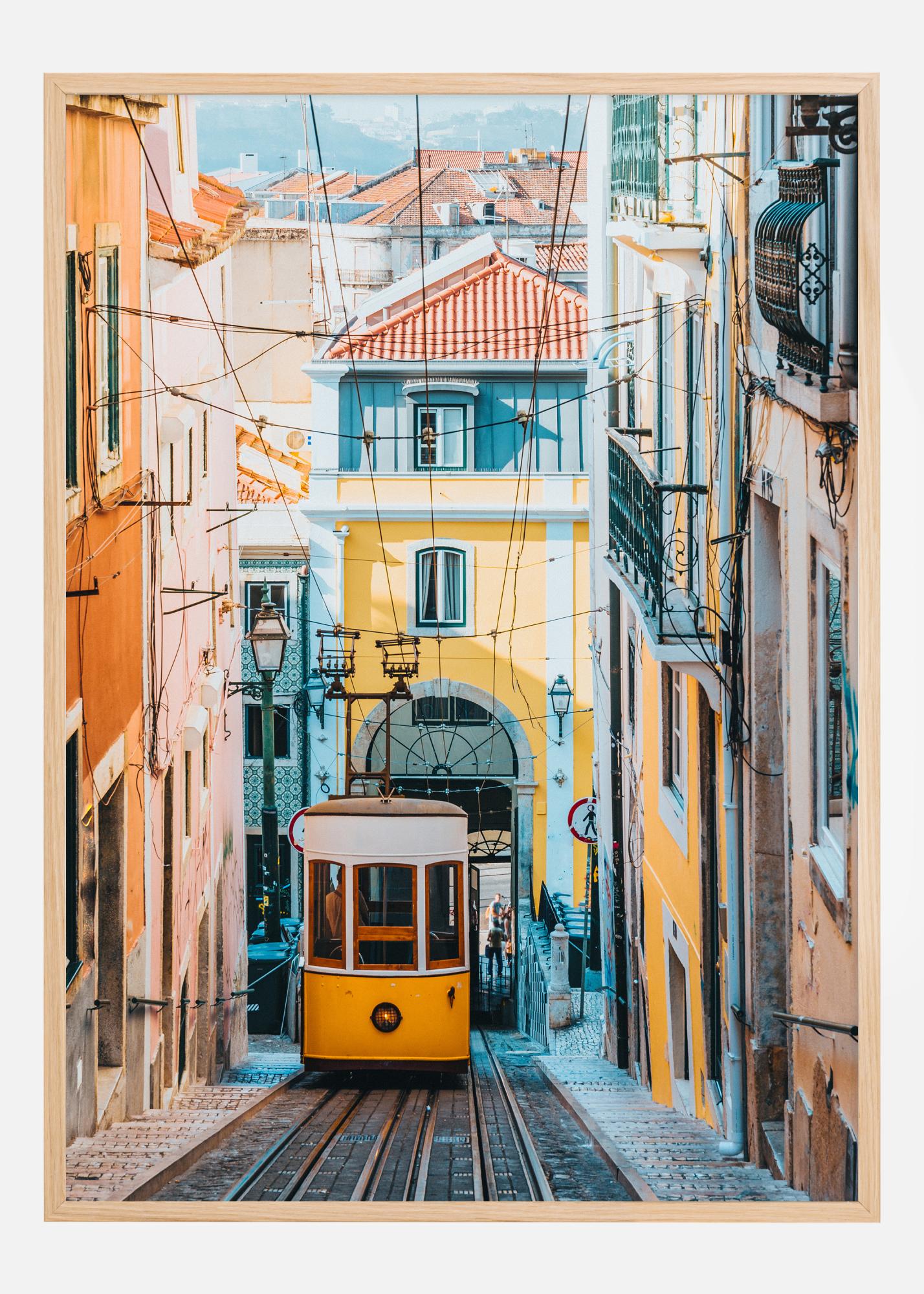 Šis spalvingas ir vaizdingas plakatas vaizduoja žavingą ir gyvybingą Europos miesto gatvės atmosferą, pilną istorijos ir kasdienybės magijos. Priekyje matome klasikinį geltoną tramvajų, ikonišką miesto viešojo transporto simbolį, kuris ramiai juda per siauras gatves, iš abiejų pusių apsuptas tradicinės architektūros šiltais geltonos ir raudonos tonais. Šis plakatas yra lyg langas į kitą pasaulį ir kviečia mus įlipti ir atrasti miesto paslaptis.