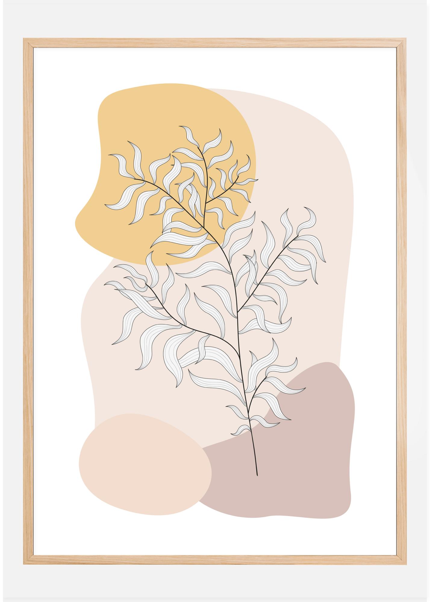 Plakatas su plonos šakos ir žalių lapų spaudiniu. Stilizuota šaka su mėtų žaliais lapais yra ant keistų formų, įvairių spalvų eilutėje. Apačioje yra pilkos ir rudos akmenys. Viršuje yra šviesiai oranžinė forma, simbolizuojanti saulę, kuri šviečia ant mažo augalėlio.