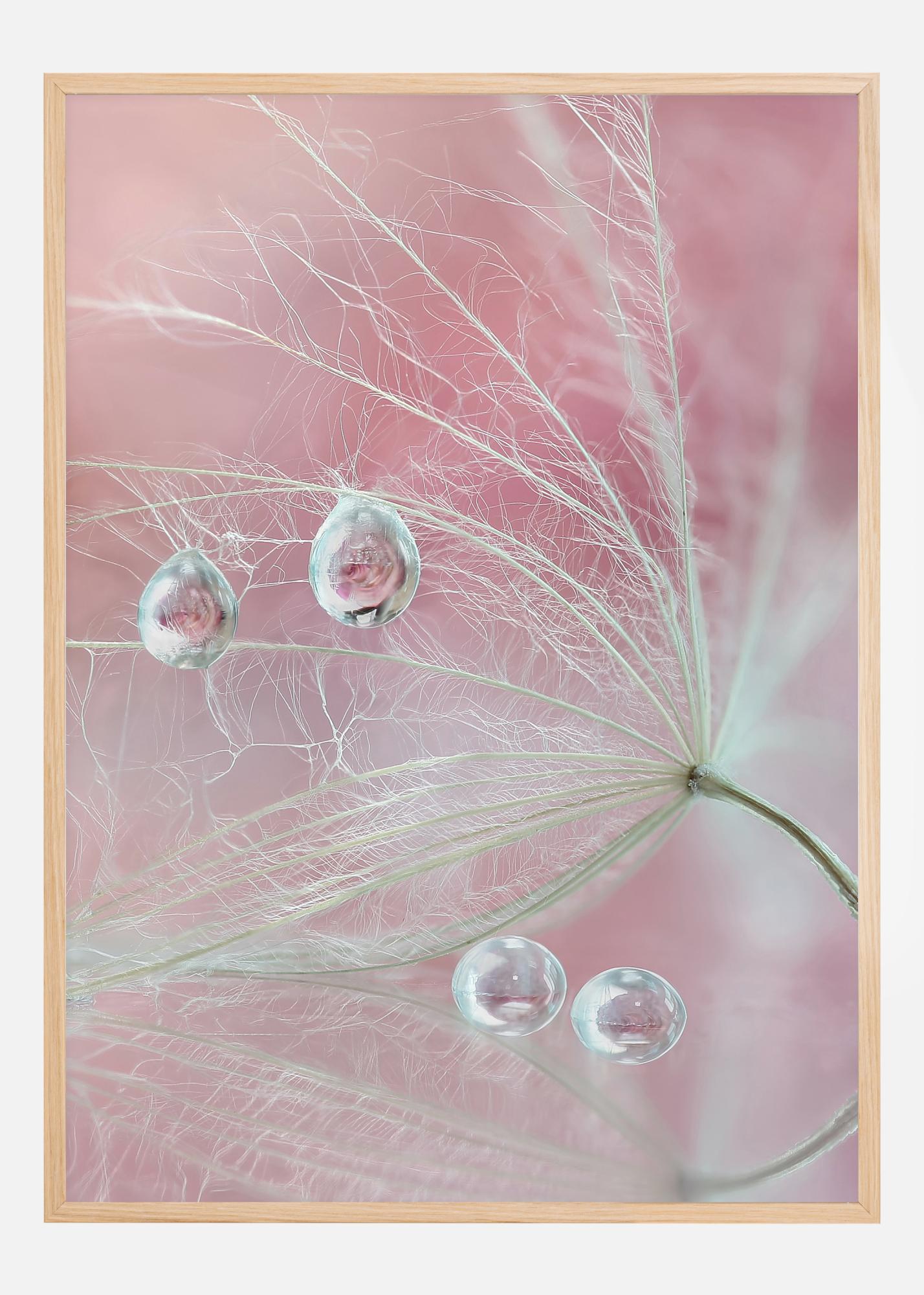 Elegantiška plakatas su voro formos gėlių galvute, su dviem vandens lašais ant trapių plunksnų formos galų. Šviesiai rožinė fonas šviečia kiekviename iš tobulų vandens lašelių, kai jie kabo tiesiai prieš krisdamos nuo gėlės. Mėgaukitės gamtos subtilia pusiausvyra.