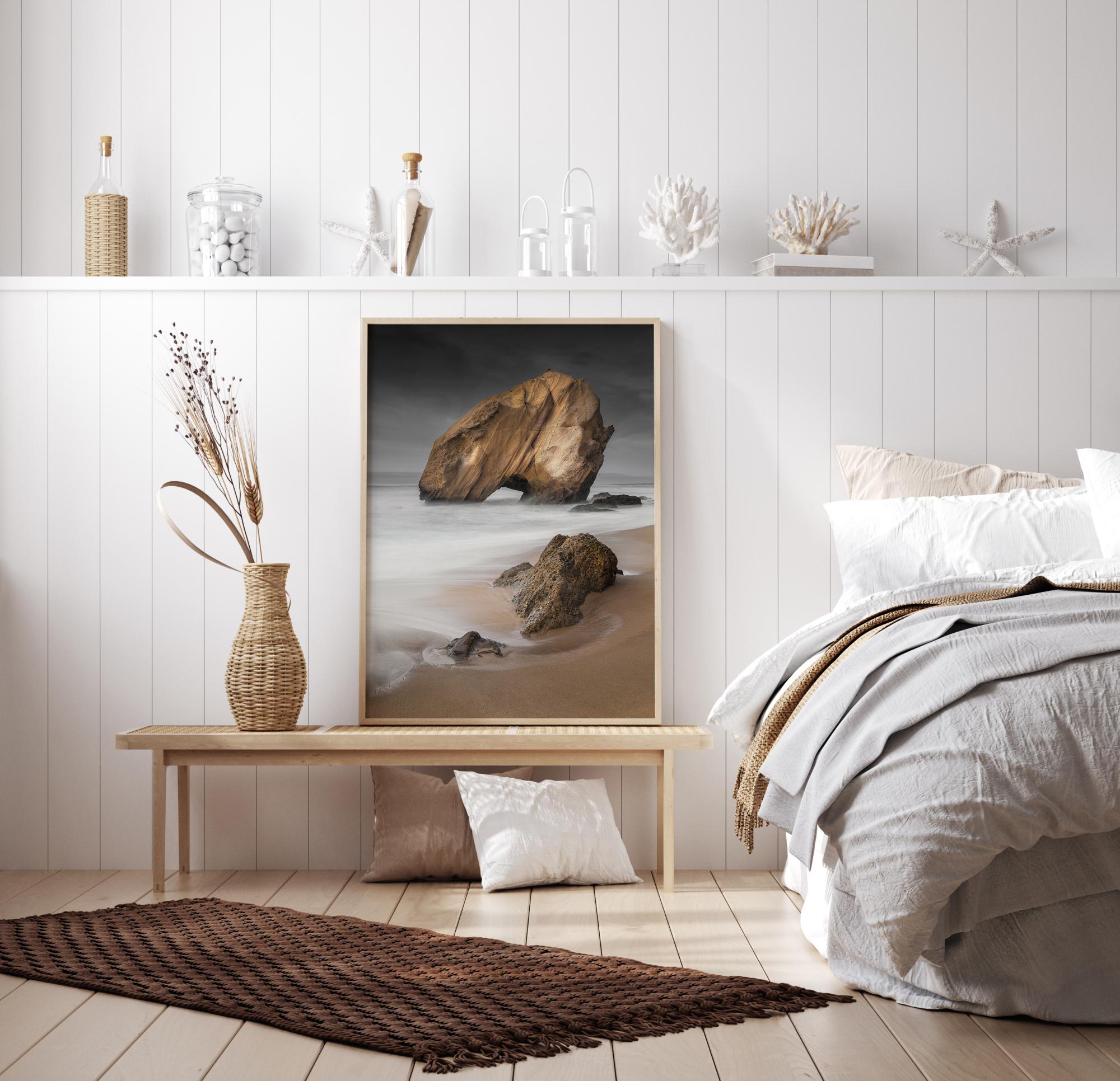 Įspūdinga plakato nuotrauka su paplūdimiu ir uolomis po audringu dangumi. Baltos jūros bangos sukasi link paplūdimio aplink stiprią smėlėtą uolą jūros viduryje. Švelnus ir nefokusuotas vaizdas slopina potencialią audrą ir sukuria ramesnę atmosferą jūsų namuose.