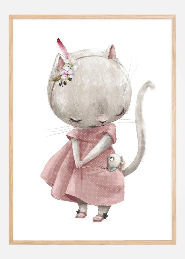 Šis žavingas plakatas rodo mielą neįprastos draugystės sceną; mažytė pelė saugiai ilsisi katės glėbyje, abu apsirengę šventiniais drabužiais. Katė yra gražiai apsirengusi rožine suknele, su elegantiška gėlių puošmena ant galvos. Šis gražus akvarelės paveikslas suteikia gyvūnams švelnumo ir šilumos, kurie spinduliuoja draugystę ir pasitikėjimą.
