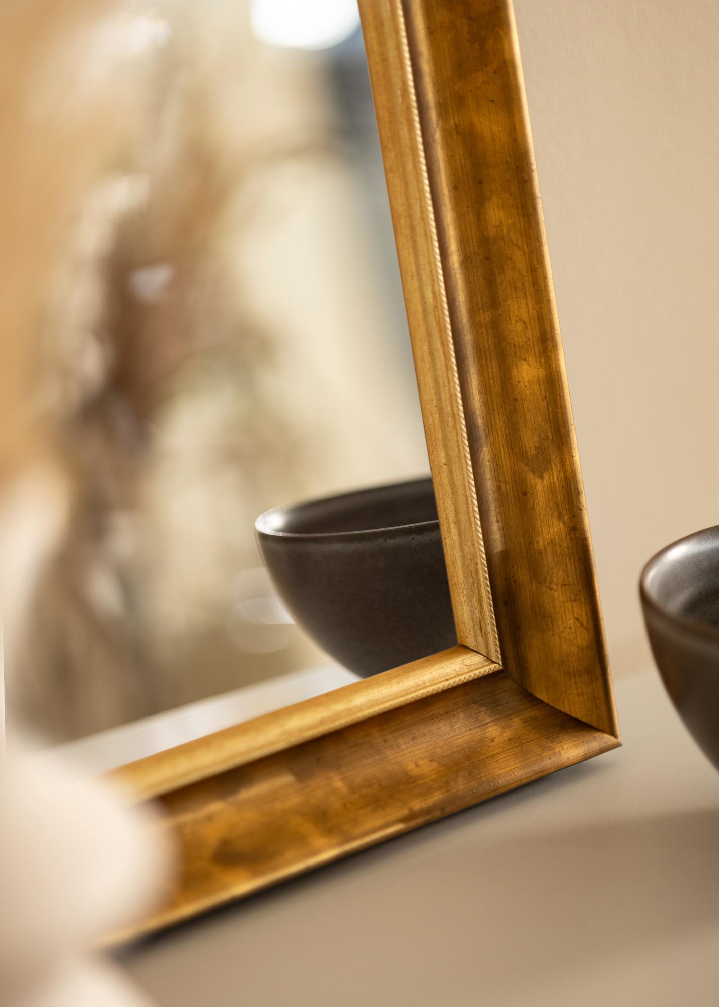 Puikus veidrodis, kurį galima užsakyti pagal norimą dydį, su nuostabiu antikvariniu auksinės spalvos profiliu su vario elementais. Su savo plačiu ir giliu profiliu šis veidrodis neabejotinai atkreipia dėmesį.