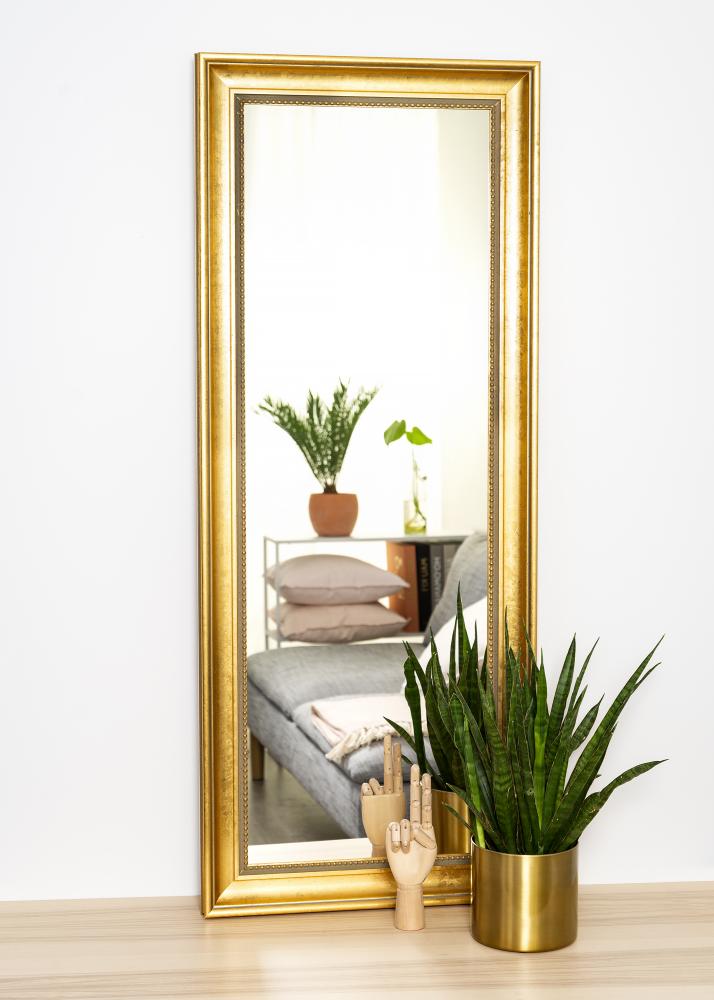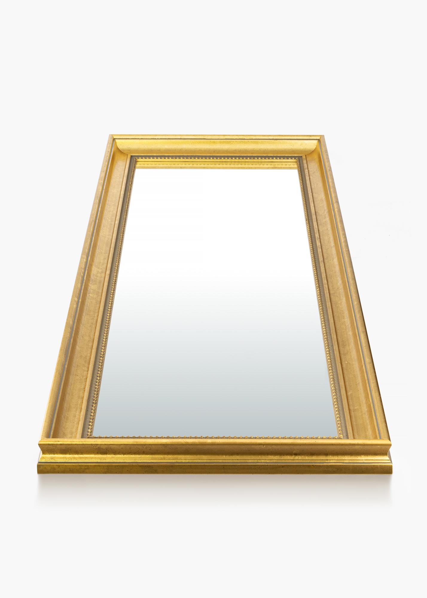 Įsigykite puošnų veidrodį ir padarykite prieškambario, svetainės ar vonios kambario interjerą dar prabangesnį. Šis stilingas veidrodis yra įvairių dydžių, todėl lengvai rasite tinkamą jūsų poreikiams. Veidrodžio rėmas turi klasikinį dizainą su plačiu rėmu ir subtiliu perlinio rašto kraštu šalia stiklo. Mediena yra iš tvarios miškininkystės ir yra nudažyta gražia auksine atspalviu.