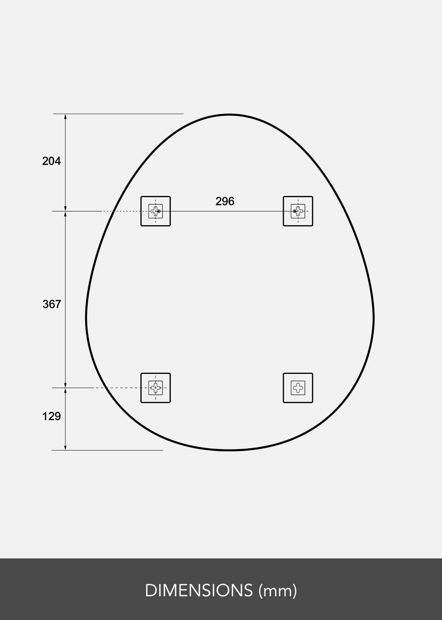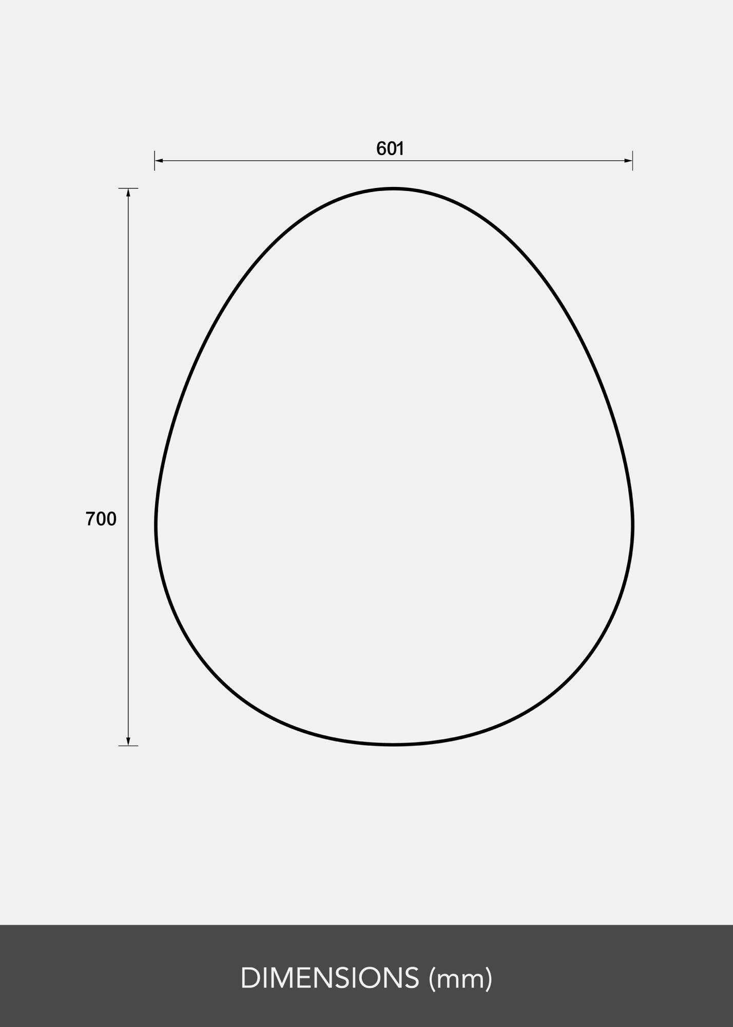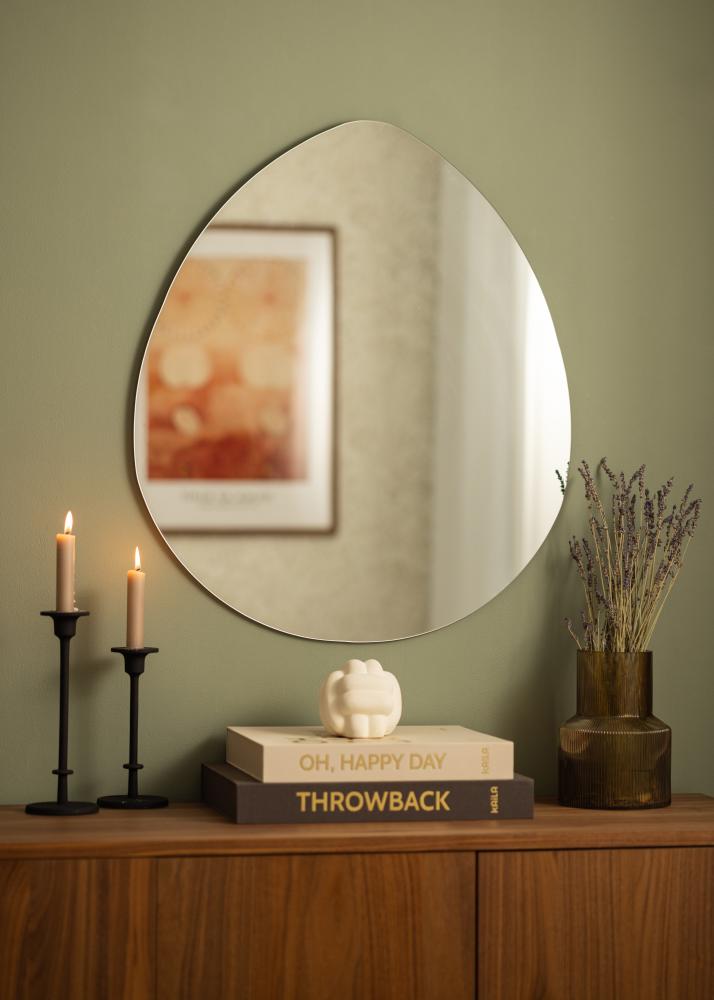 Veidrodis turi suapvalintą, kiaušinio formos kontūrą su plokščiu dugnu, kuris suteikia švelnią ir modernią estetiką. Dėl unikalios formos jis išsiskiria iš kitų ir tampa įdomiu pokalbio objektu. Tai ne tik veidrodis, bet ir meno kūrinys, kuris puošia jūsų namus.