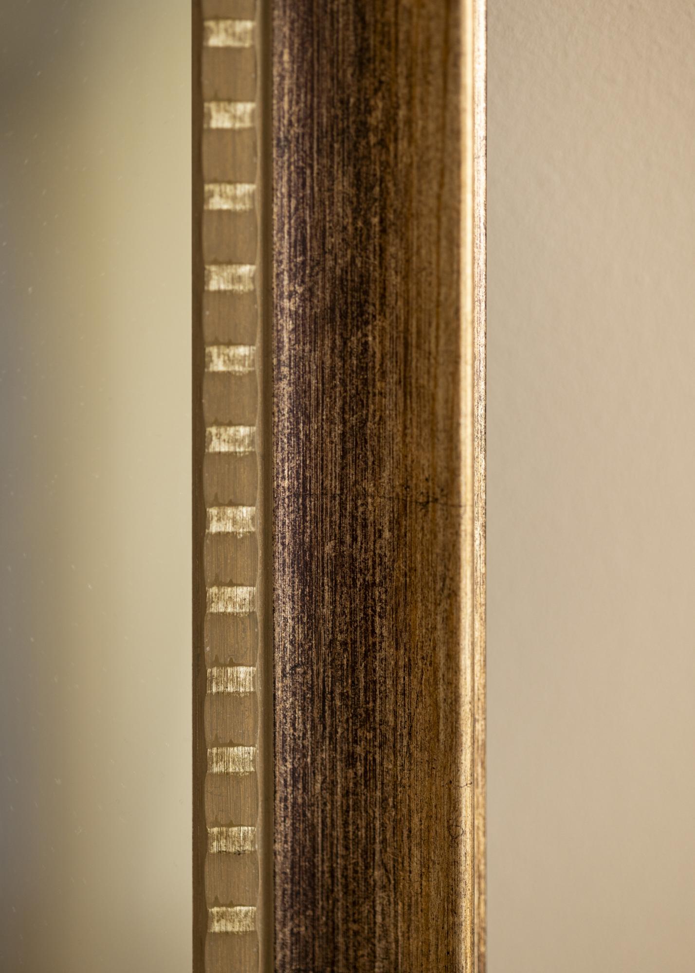 Dekoratyvinis vidinis kraštas papuoštas mažomis, reguliariomis aukso spalvos detalėmis. Jos sukuria elegantišką kontrastą su tamsesniu medžio tonu ir prideda papildomą išlavintos elegancijos dimensiją. Išorinis kraštas turi švelnią fasadą su diskretišku aukso apdaila, kuri suteikia rėmui prabangų ir nesenstantį pojūtį, kuris niekada neišeina iš mados.