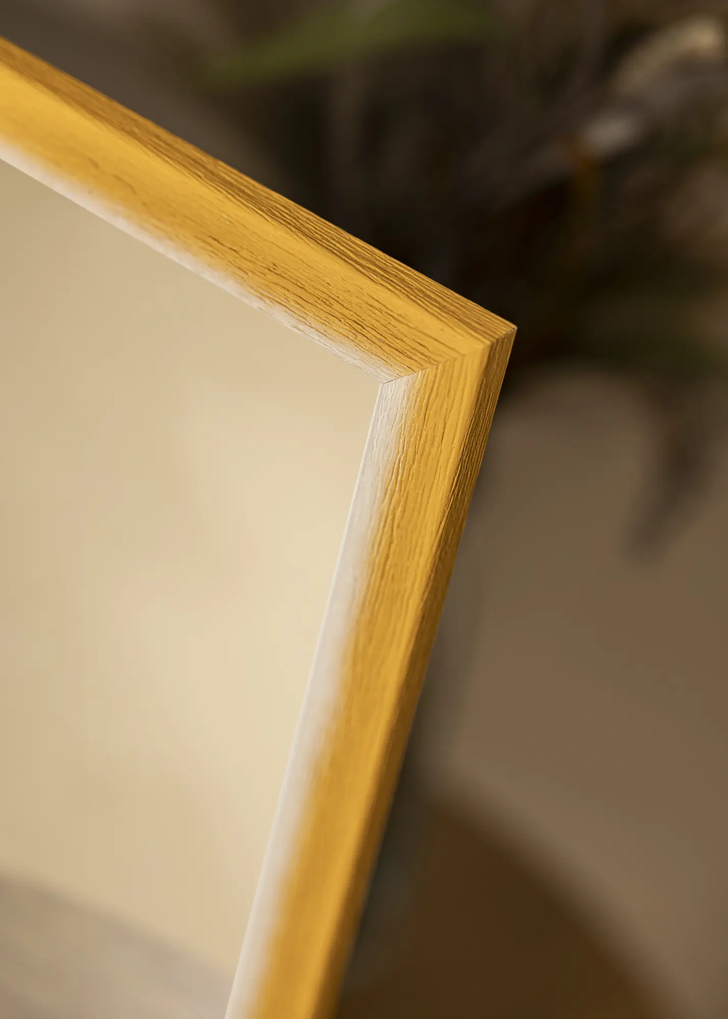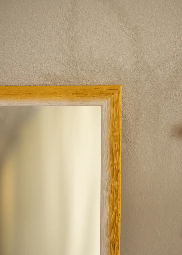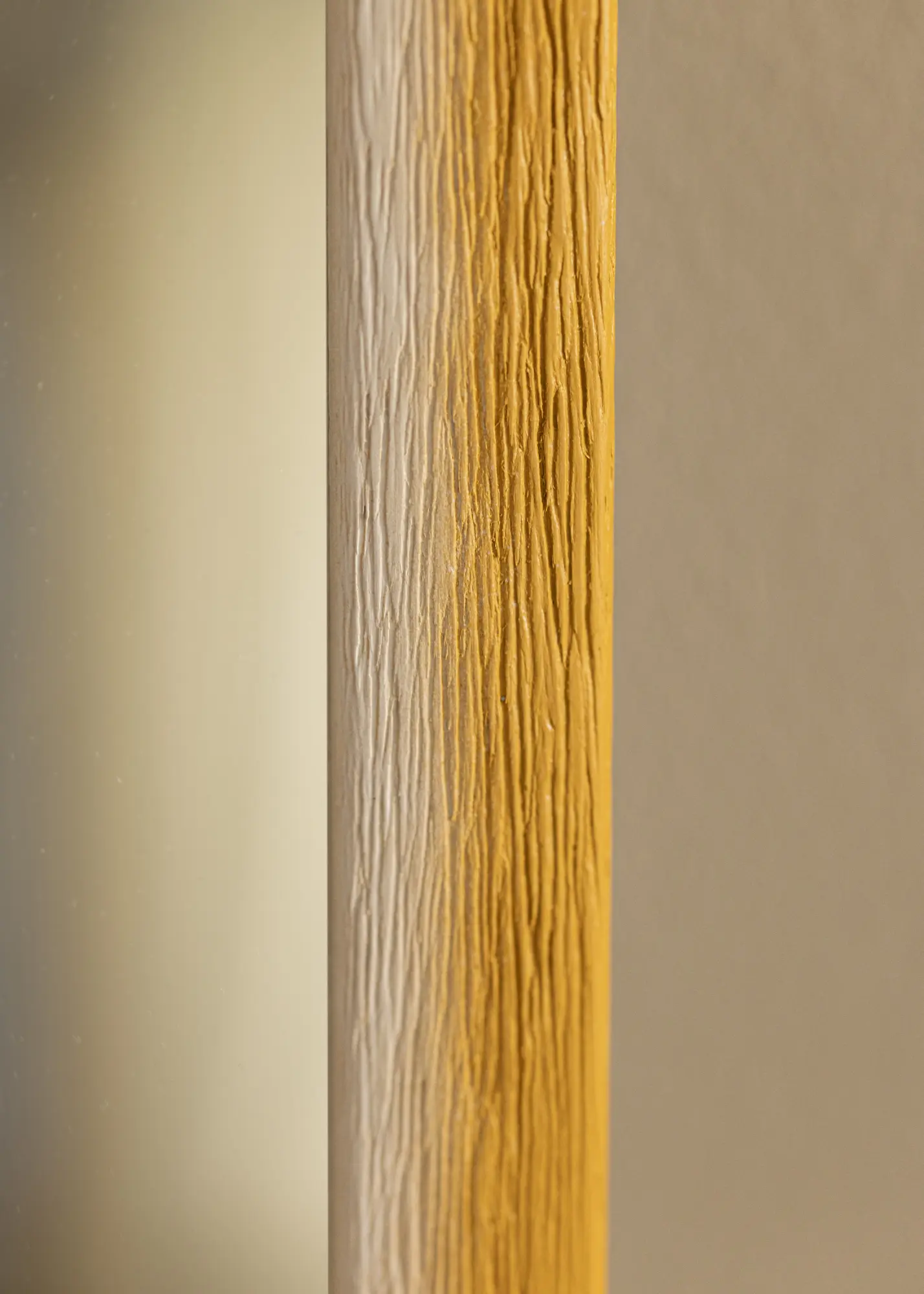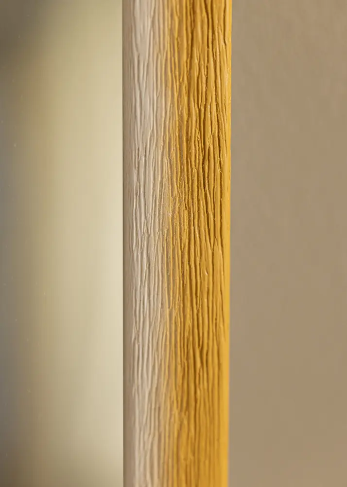 Šis veidrodis išsiskiria savo harmoningu spalvų perėjimu nuo šviesaus, natūraliai balto atspalvio iki šiltos ochros geltonos spalvos. Šis subtilus perėjimas sukuria švelnų, nudažytą išraišką, kuri suteikia kambariui gyvą gylį. Rėmo paviršius pasižymi aiškia medžio struktūra su giliomis rievėmis, kas suteikia taktilinį ir natūralų pojūtį. Tai lemia, kad veidrodis yra ne tik funkcionalus, bet ir dekoratyvinė detalė jūsų namuose.