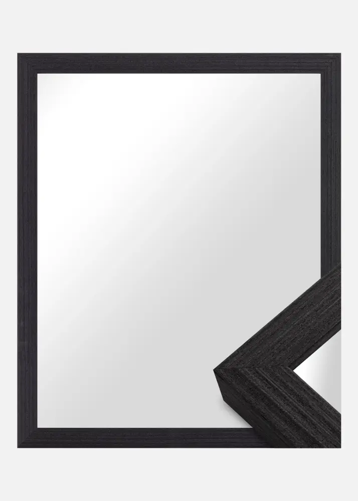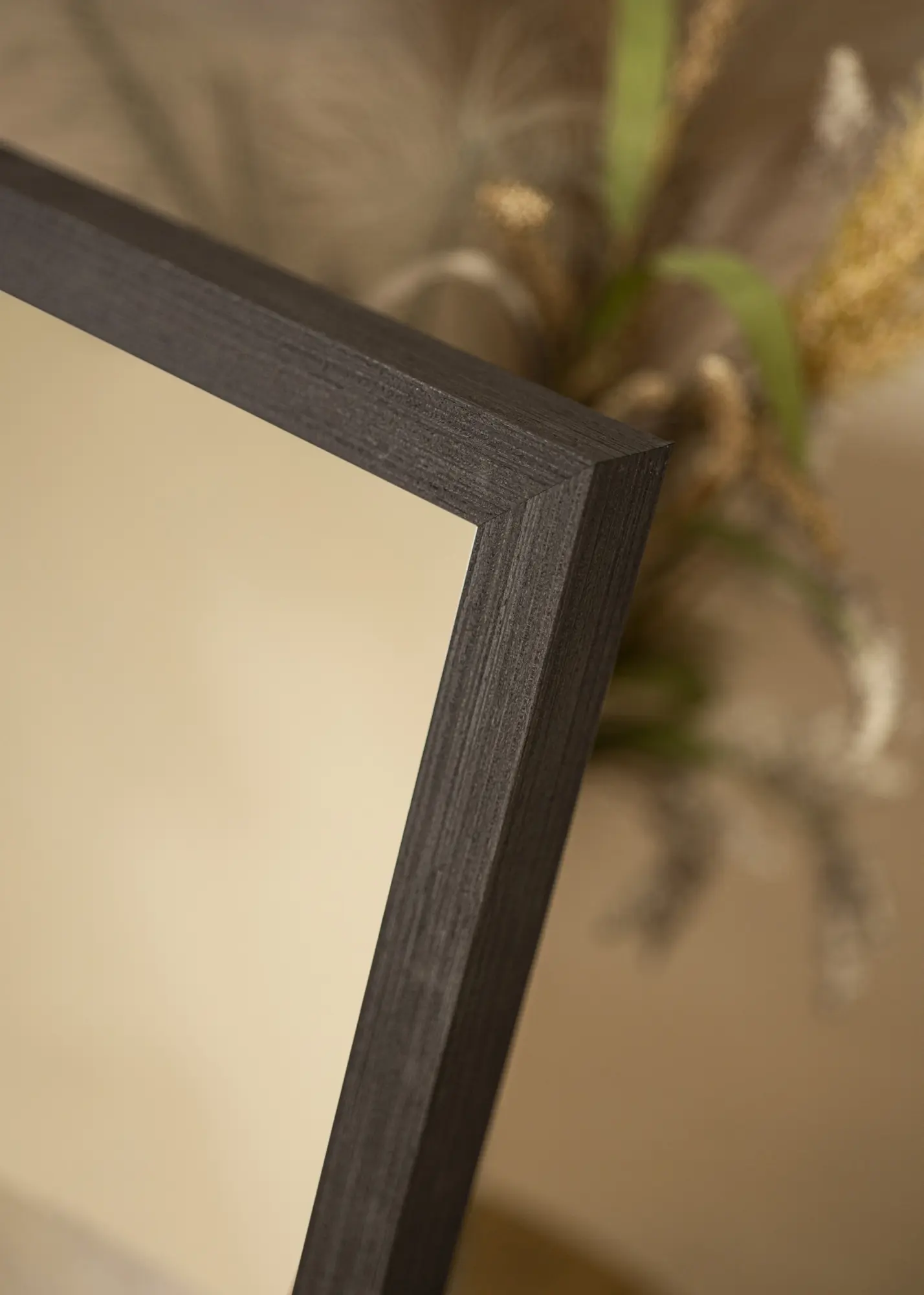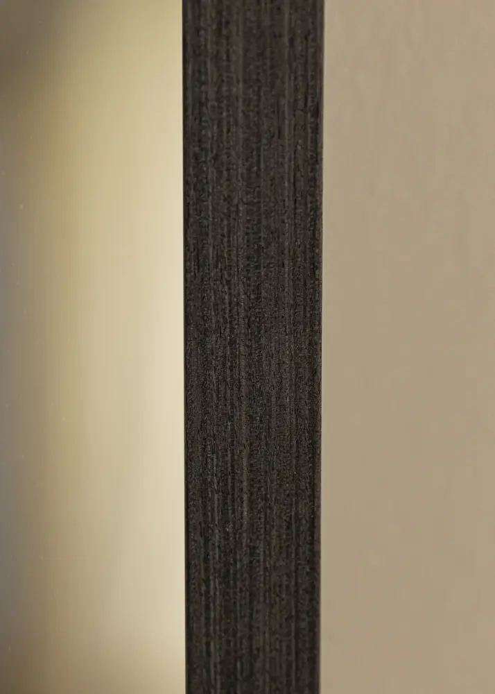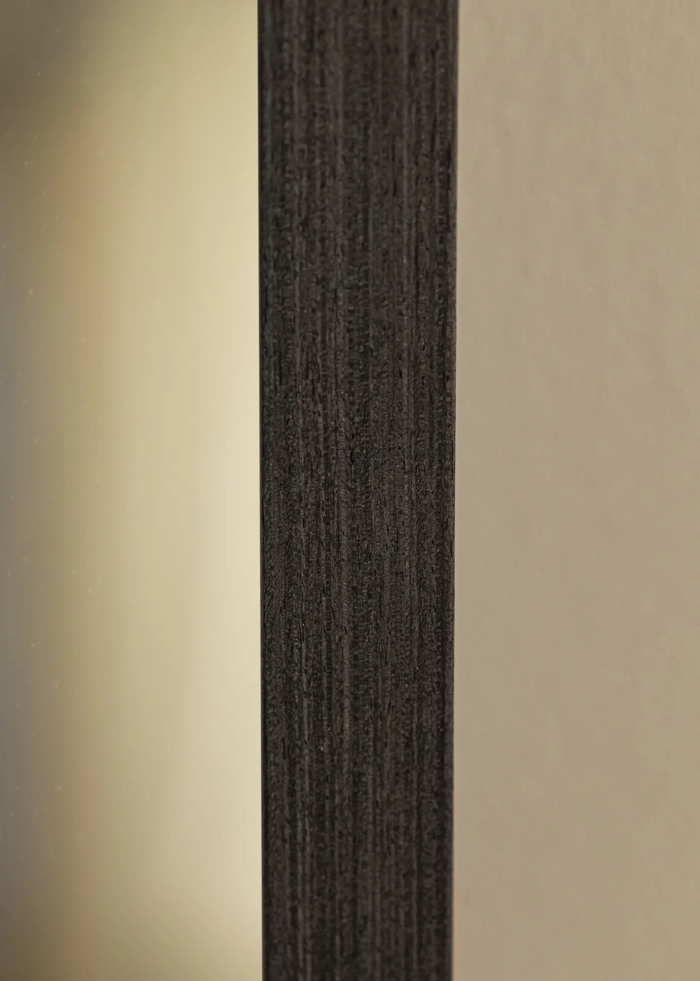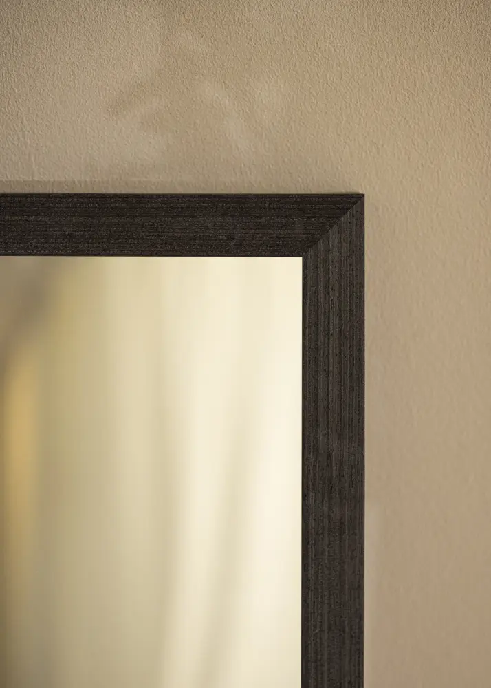 Veidrodžio rėmas yra 28 mm pločio ir 33 mm gylio, o tai suteikia stabilumo ir tvirto pojūčio neperkraunant kambario. Juoda rėmo spalva suteikia šiuolaikiškumo ir sukuria gražų kontrastą su veidrodžio stiklu. Pagamintas iš pušies, šis veidrodis siūlo tiek patvarumą, tiek natūralų pojūtį, kuris papildo jo stilingą išvaizdą.