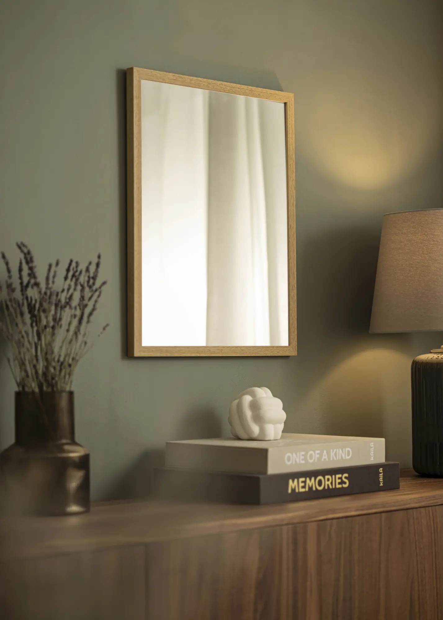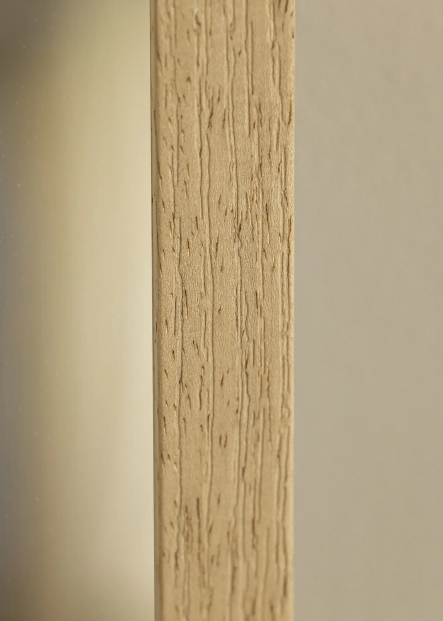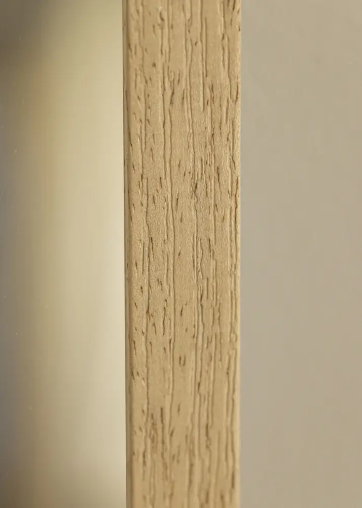 Veidrodžio rėmas pagamintas iš ajos medis, kas suteikia tiek patvarumą, tiek stilių. Su 20 mm pločio ir 20 mm gylio rėmas turi diskretišką, bet vis tiek aiškią buvimo vietą, kuri įrėmina veidrodžio stiklą skoningu būdu. Paviršius turi matinį užbaigimą ir šiek tiek struktūrizuotą pojūtį, kas prisideda prie veidrodžio žavesio ir padaro jį puikiu pasirinkimu tiek moderniam, tiek tradiciniam interjerui.