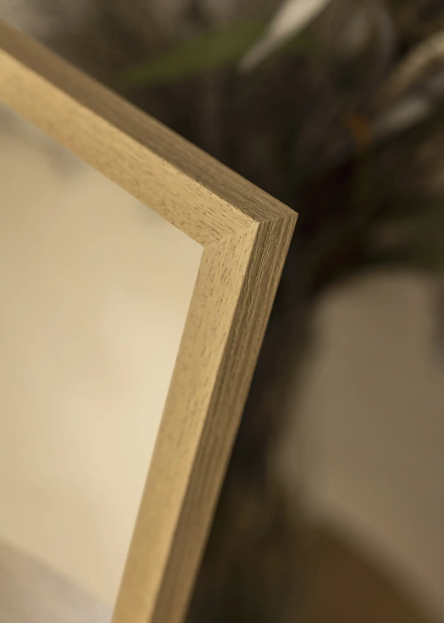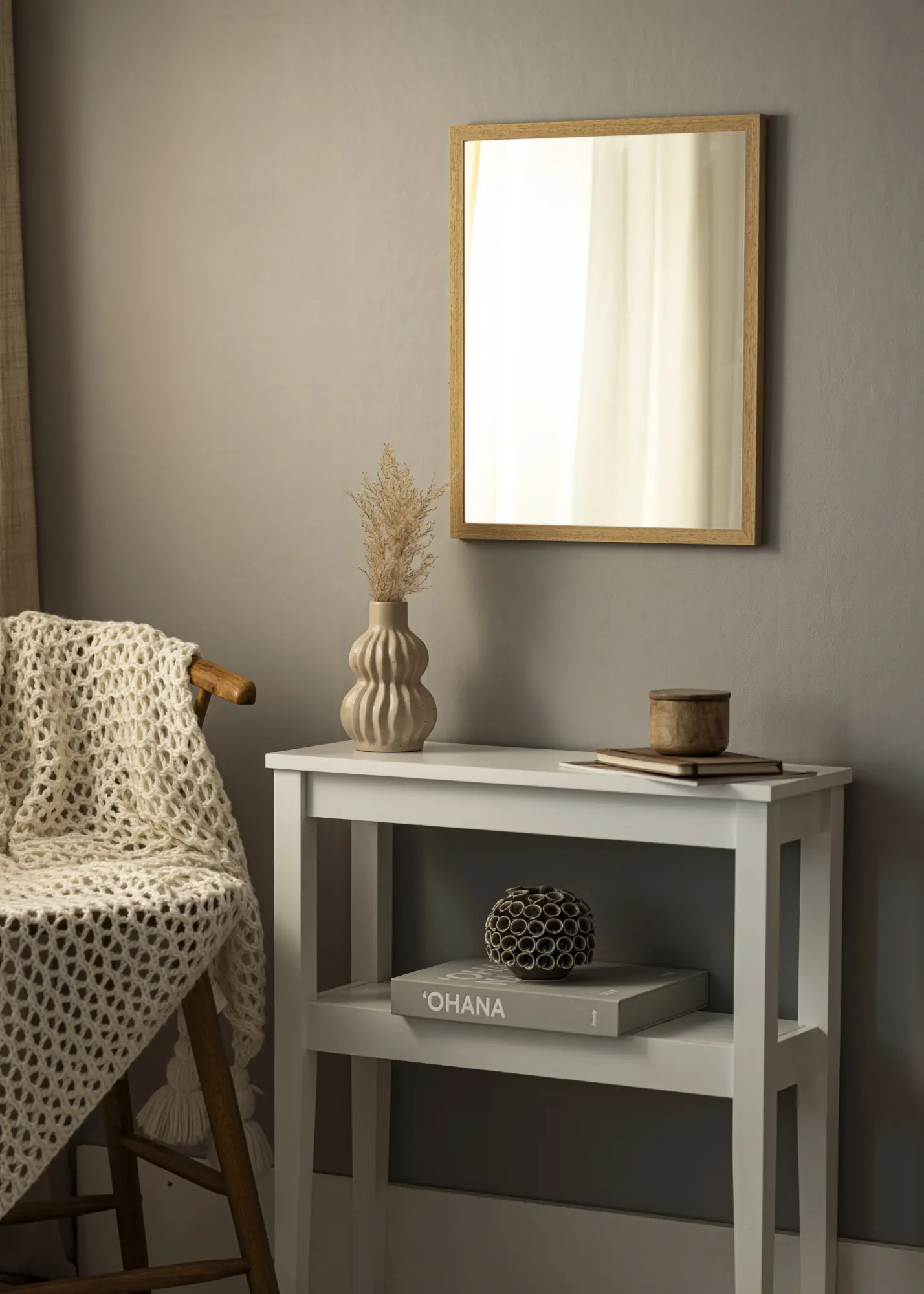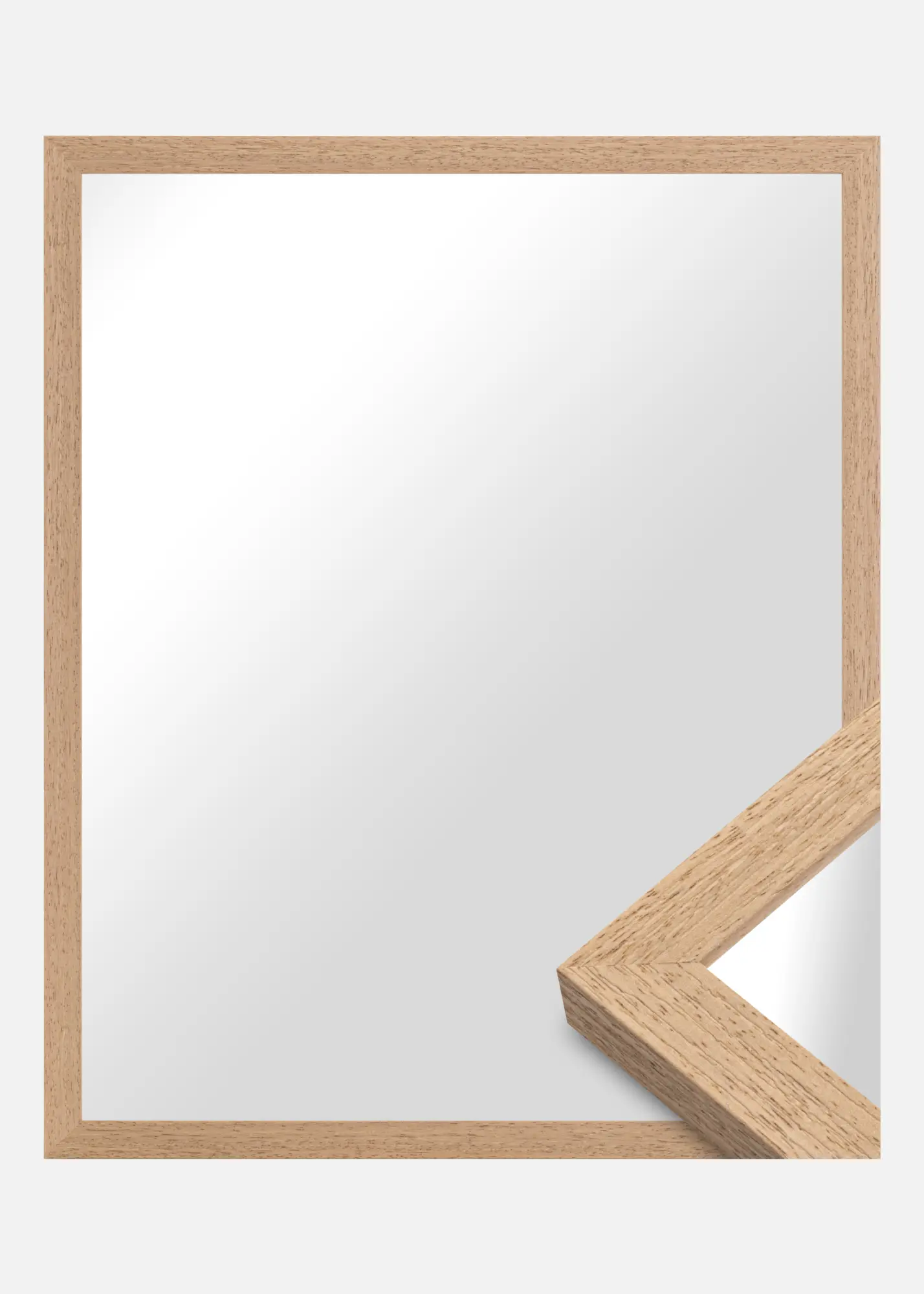 Veidrodžio rėmas pagamintas iš ajos medis, kas suteikia tiek patvarumą, tiek stilių. Su 20 mm pločio ir 20 mm gylio rėmas turi diskretišką, bet vis tiek aiškią buvimo vietą, kuri įrėmina veidrodžio stiklą skoningu būdu. Paviršius turi matinį užbaigimą ir šiek tiek struktūrizuotą pojūtį, kas prisideda prie veidrodžio žavesio ir padaro jį puikiu pasirinkimu tiek moderniam, tiek tradiciniam interjerui.