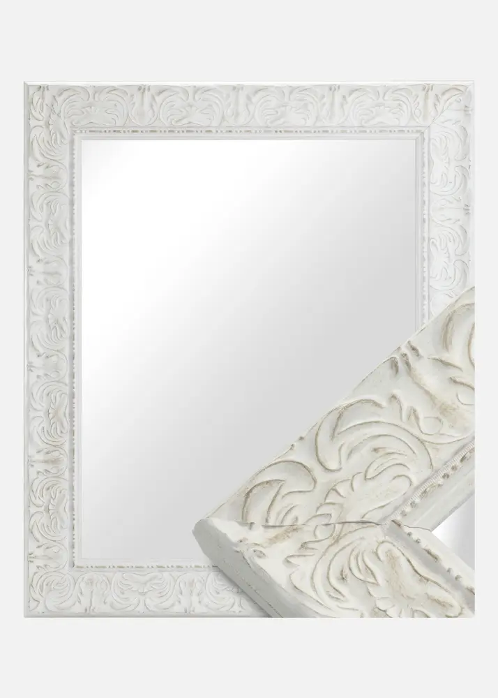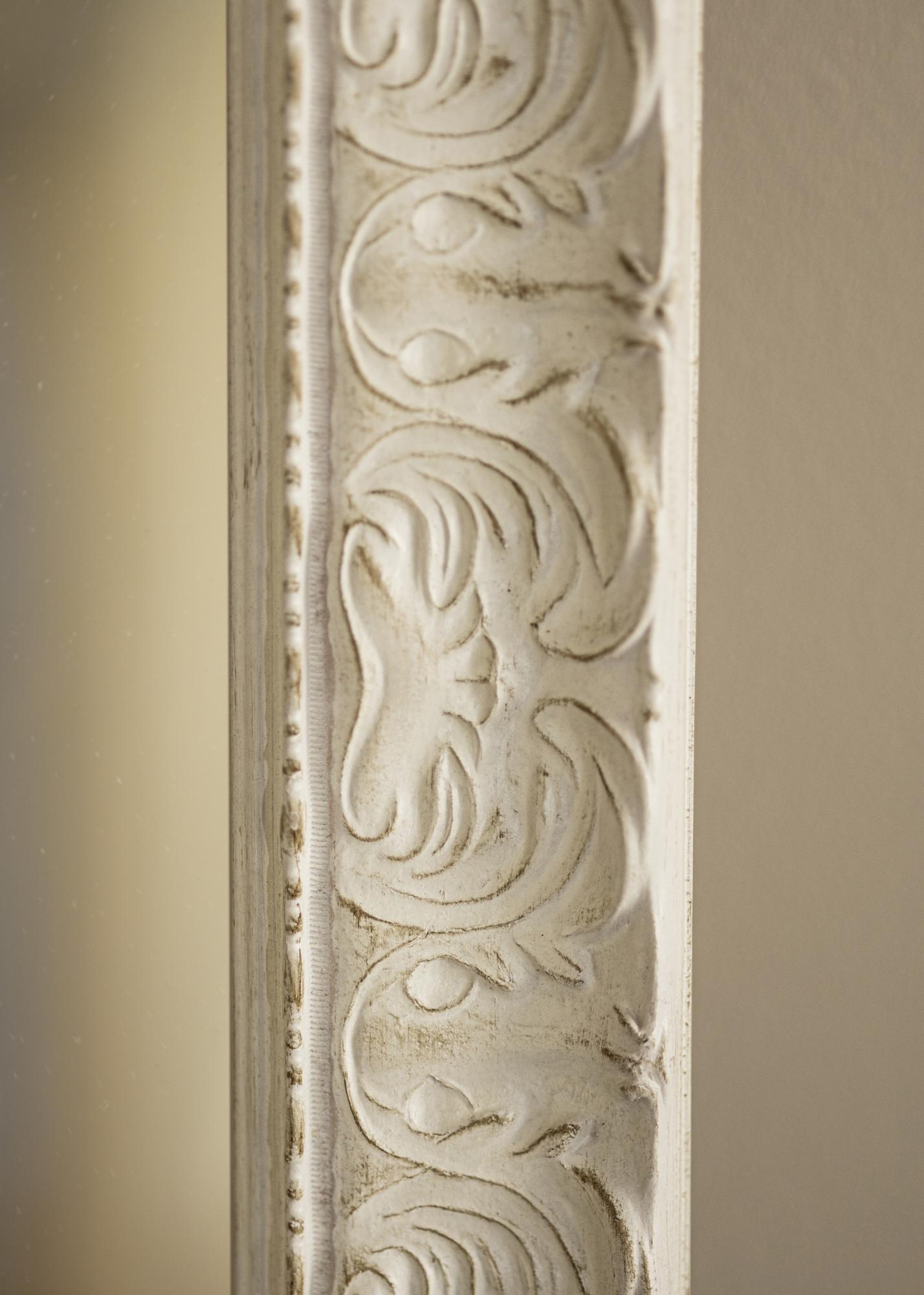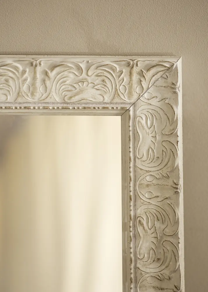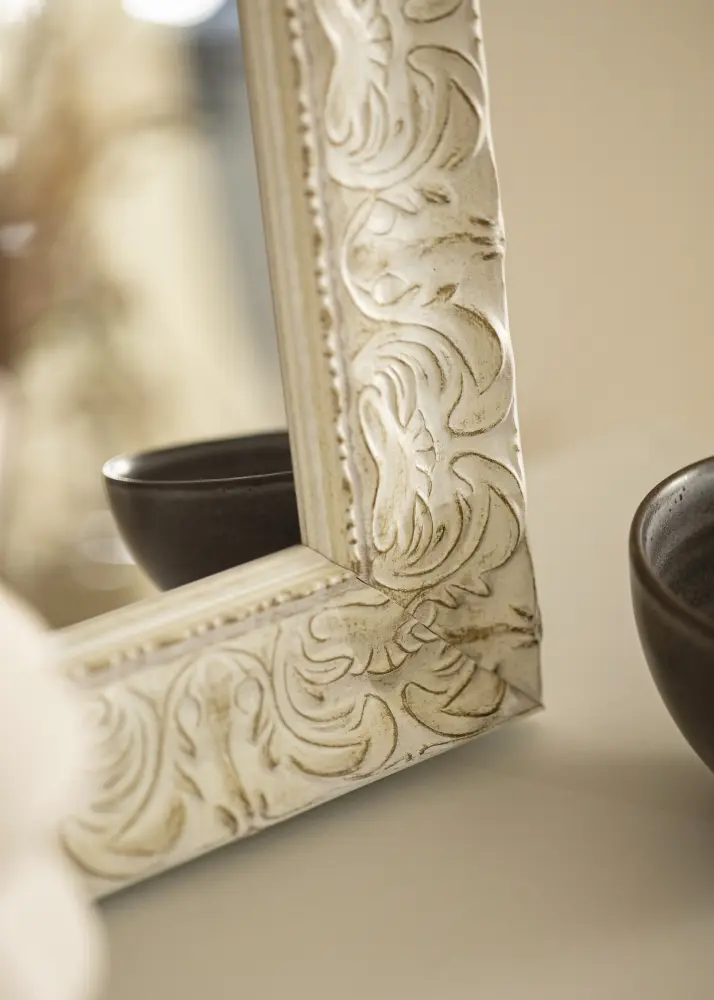 Veidrodžio antikvarinis baltas apdaila su dekoratyviniu reljefu ir subtiliai dėvėtu paviršiumi suteikia jam unikalų charakterį. Papuoštos detalės sustiprina jo klasikinę išraišką ir padaro jį patraukliu akcentu kambaryje. Nesvarbu, ar turite modernų, ar tradicinį interjerą, šis veidrodis prisiderins ir tuo pačiu suteiks kažką ypatingo.