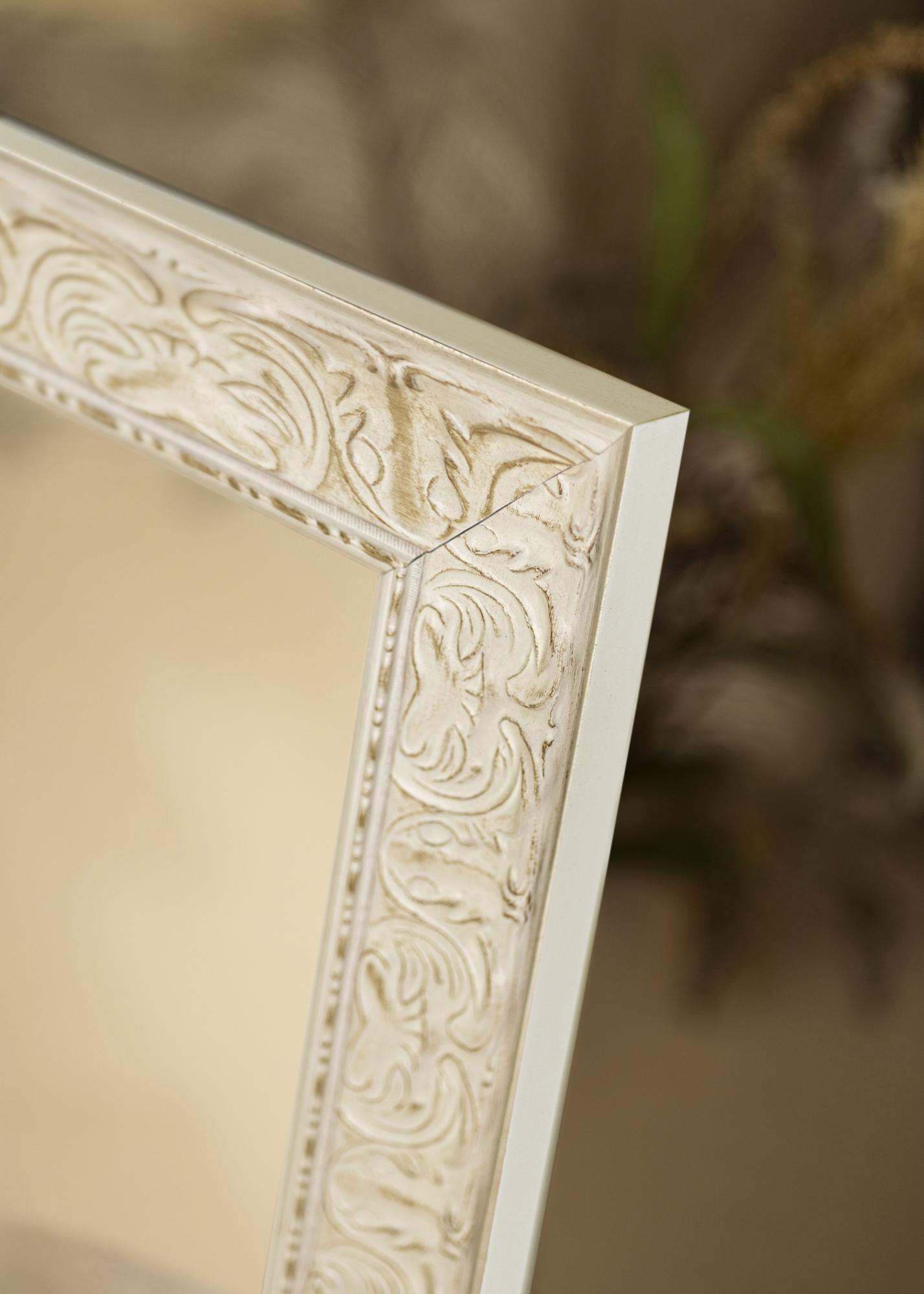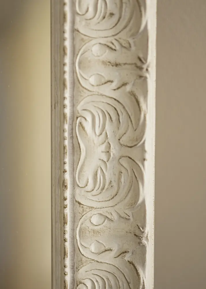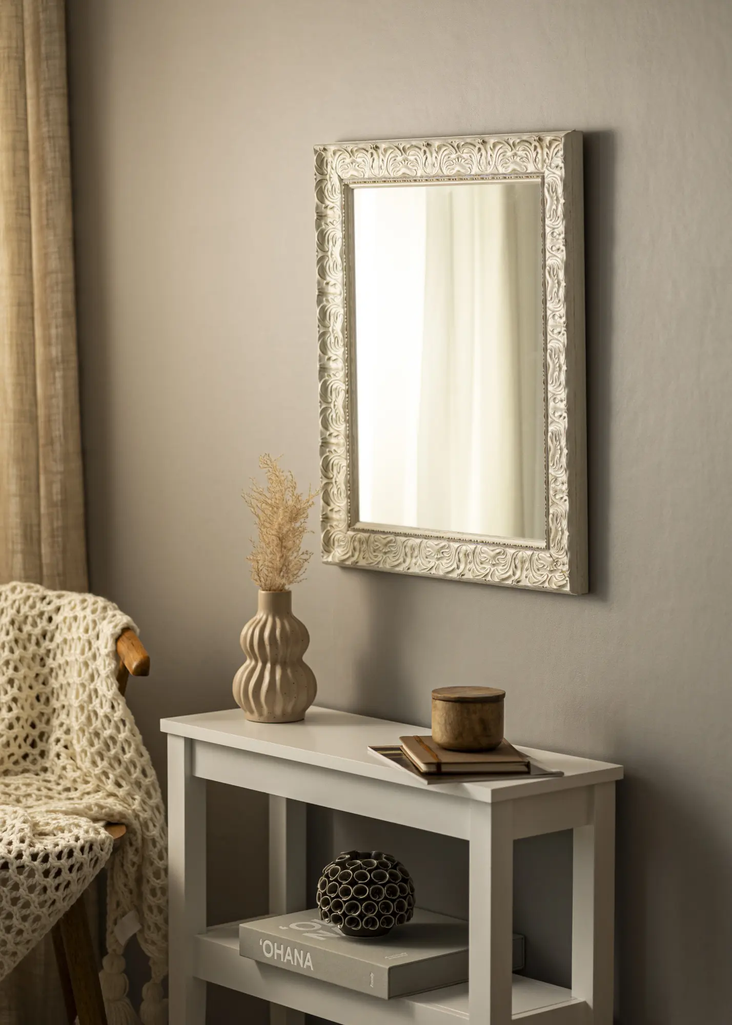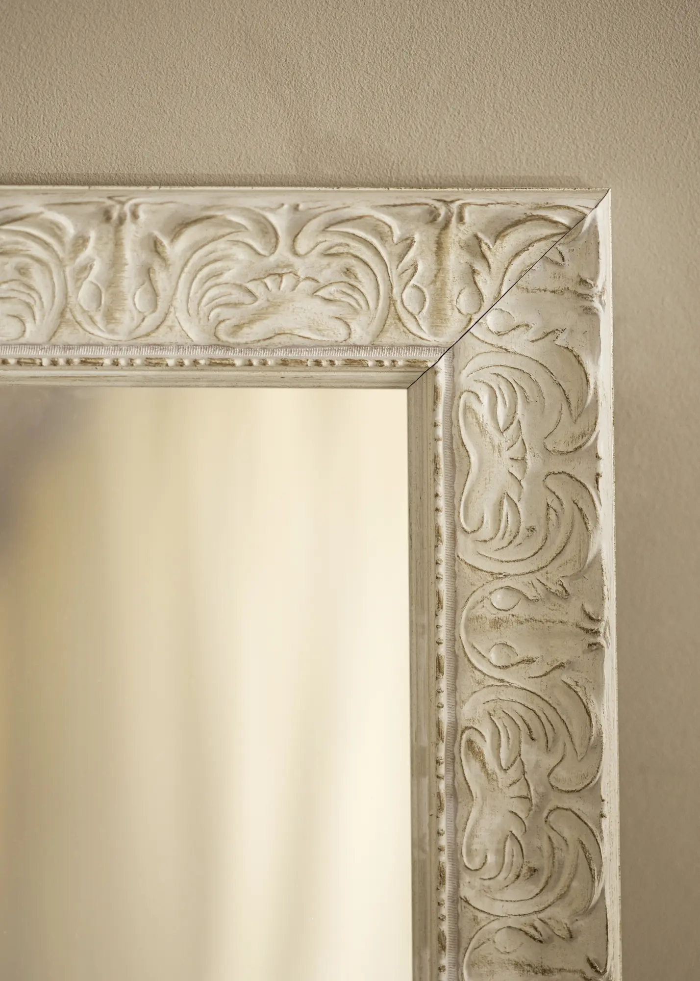 Veidrodžio antikvarinis baltas apdaila su dekoratyviniu reljefu ir subtiliai dėvėtu paviršiumi suteikia jam unikalų charakterį. Papuoštos detalės sustiprina jo klasikinę išraišką ir padaro jį patraukliu akcentu kambaryje. Nesvarbu, ar turite modernų, ar tradicinį interjerą, šis veidrodis prisiderins ir tuo pačiu suteiks kažką ypatingo.