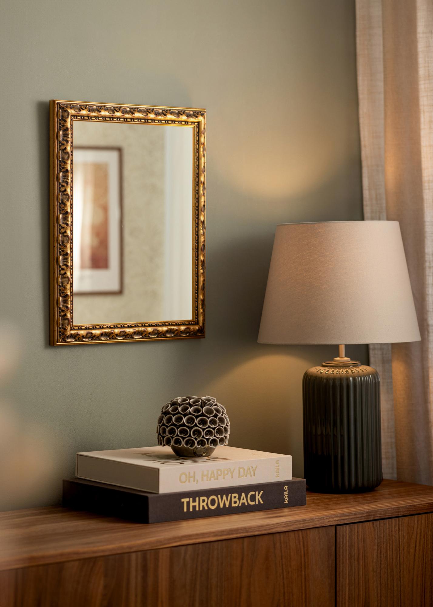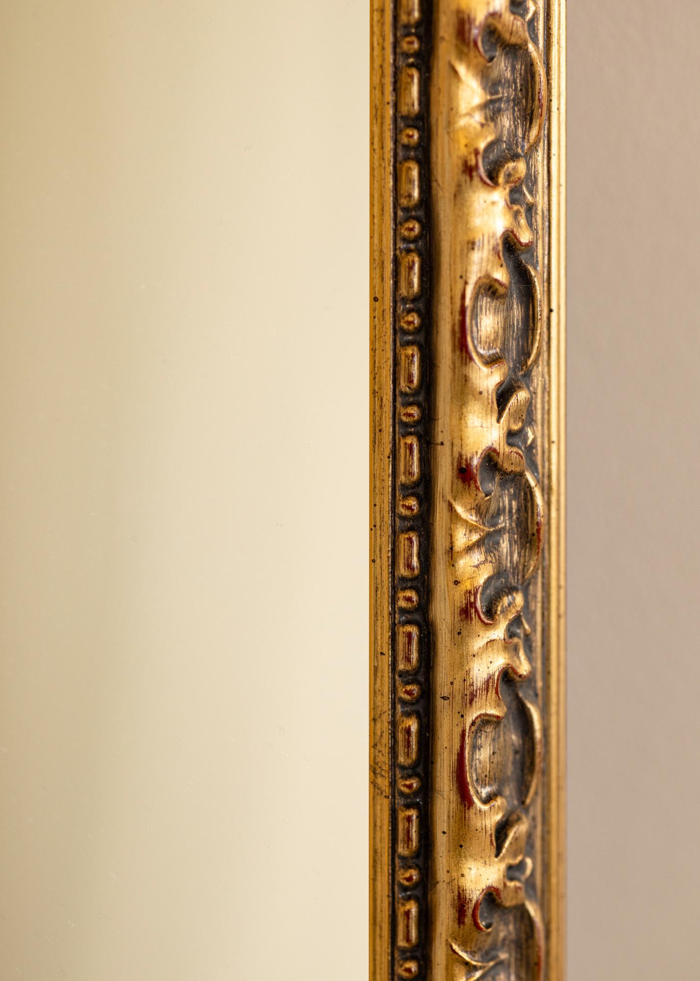 Veidrodžio Freyja Gold rėmas yra 38 mm pločio ir 34 mm gylio, suteikiant veidrodžiui tvirtumo ir patikimumo pojūtį. Pagamintas iš pušies, jis derina patvarumą su klasikine estetika. Antikinė apdaila su tamsiomis patinuotomis detalėmis ir subtiliais raudonais akcentais sustiprina veidrodžio kaimišką pobūdį ir suteikia jam nesenstančios žavesio.
