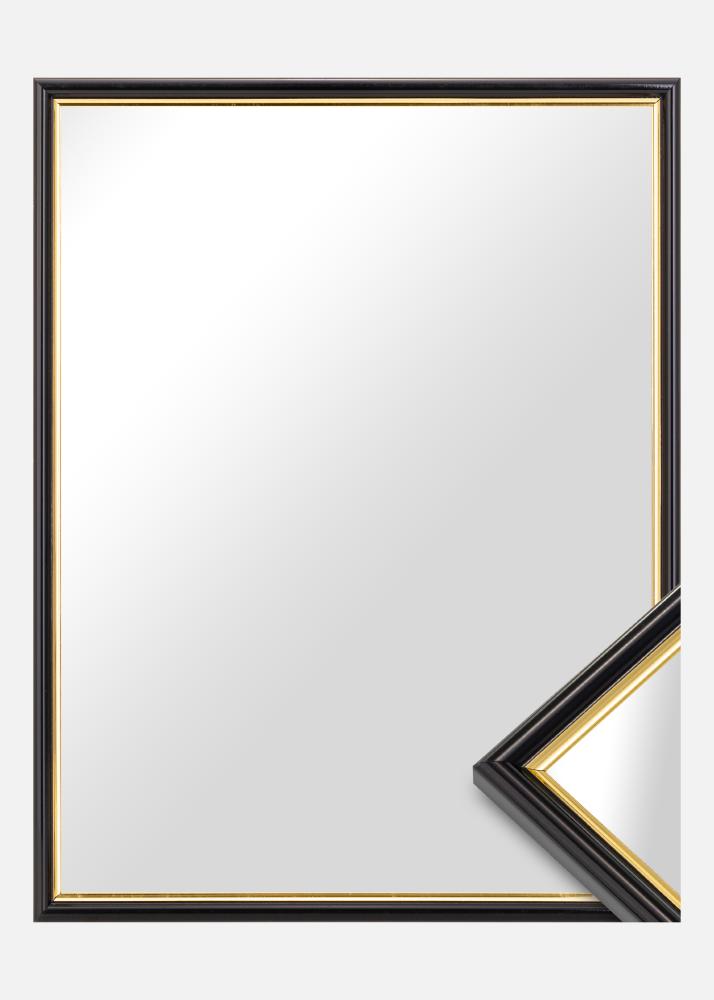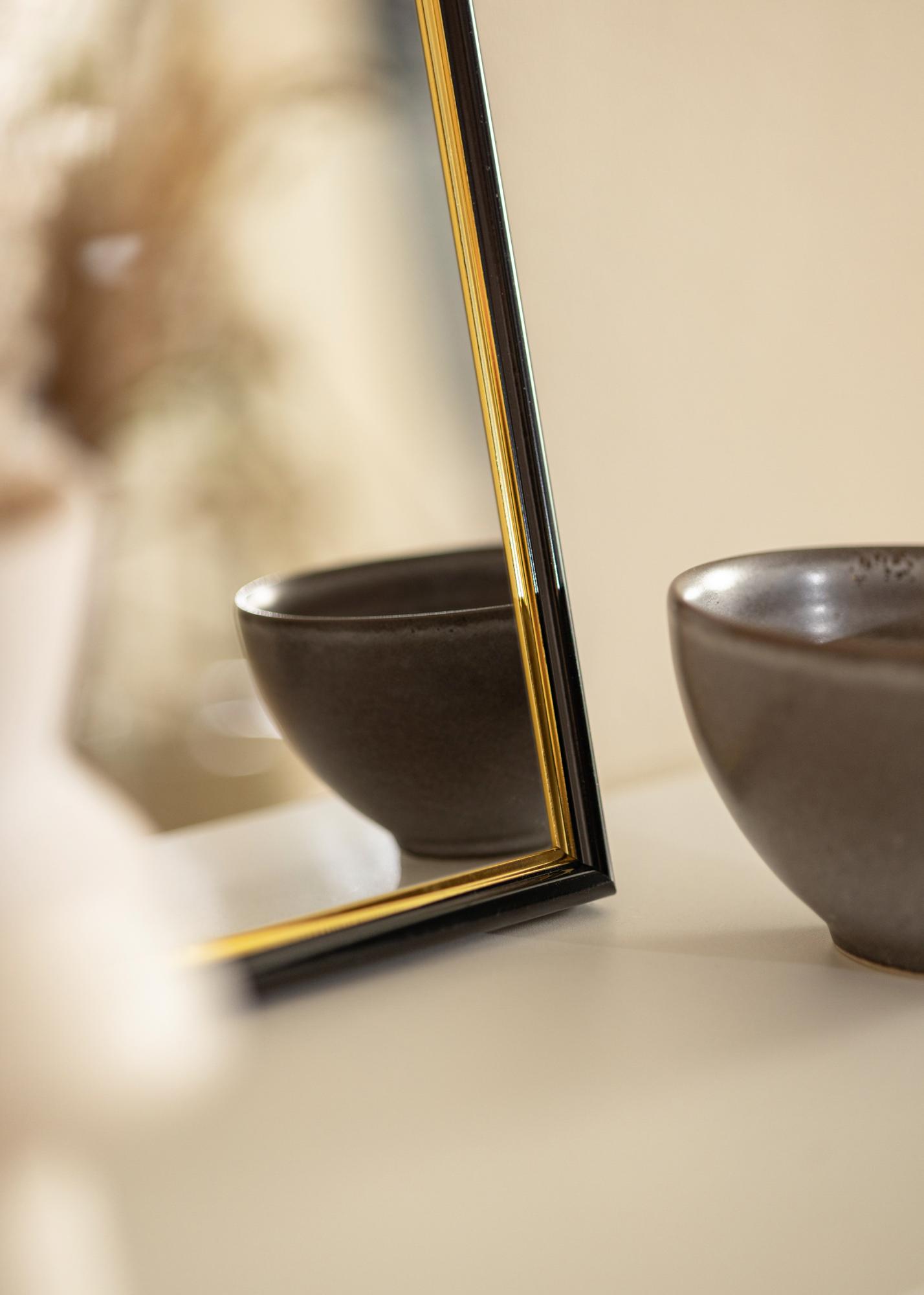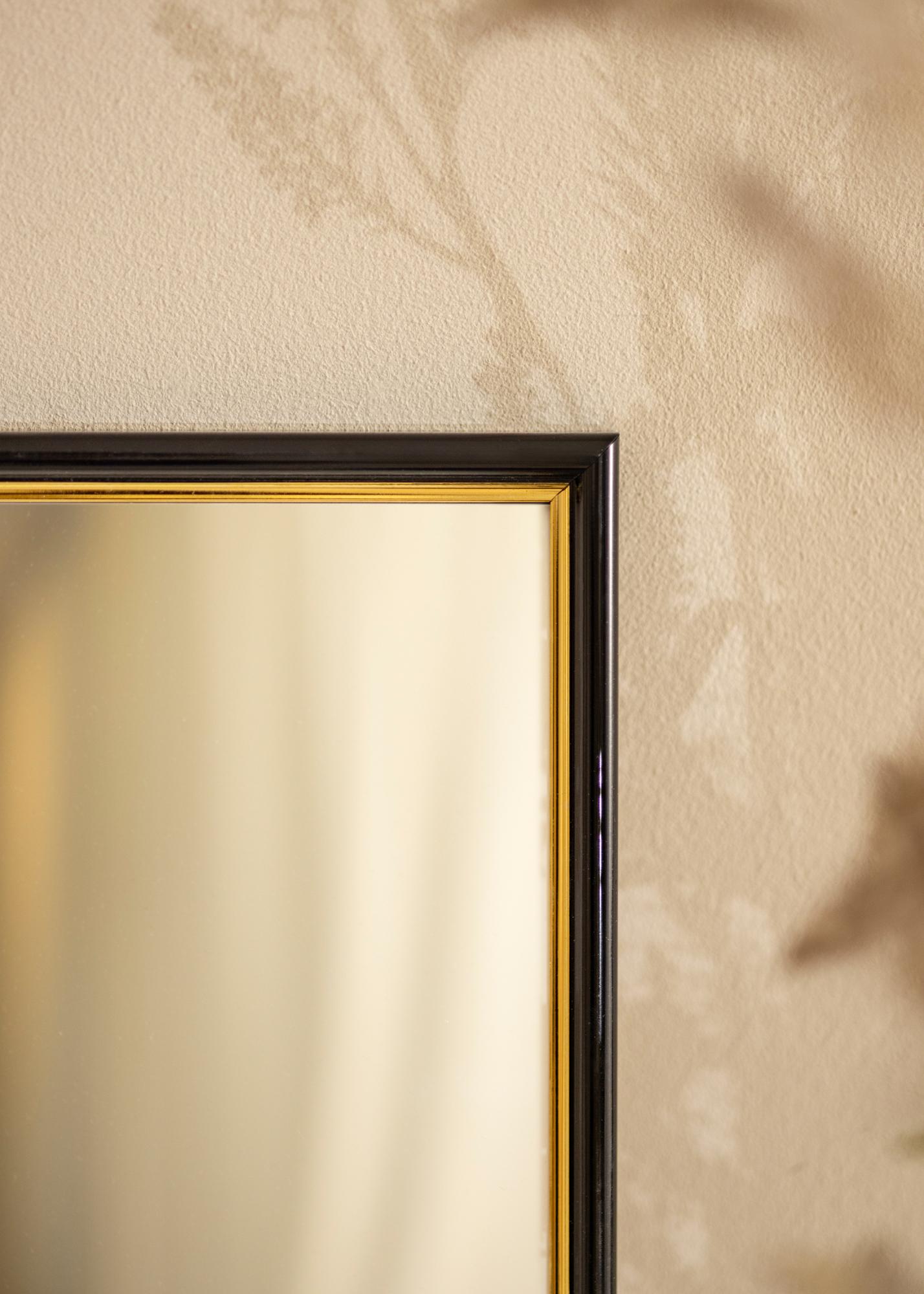 Pakeiskite atmosferą koridoriuje, vonios kambaryje ar svetainėje pakabindami šį prabangų veidrodį! Veidrodis yra juodas su auksiniu pavidalu arčiausiai stiklo. Spalvos puikiai dera su interjero detalėmis, pavyzdžiui, juoda, auksine, violetine arba pastelinių atspalvių. Kadangi jis gaminamas pagal jūsų pageidavimus, galite būti tikri, kad puikiai tiks ten, kur norite jį turėti.